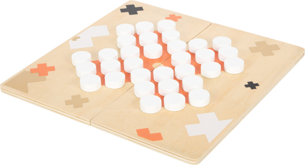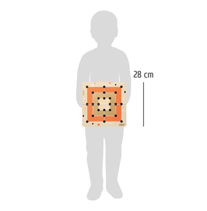 Kétrészes, mágnesesen záródó fa tábla két klasszikushoz (Malom és Peg-Solitaire). Letisztult dizájn terrakotta, fekete/fehér és arany elemekkel; kellemes tapintású fa korongok.