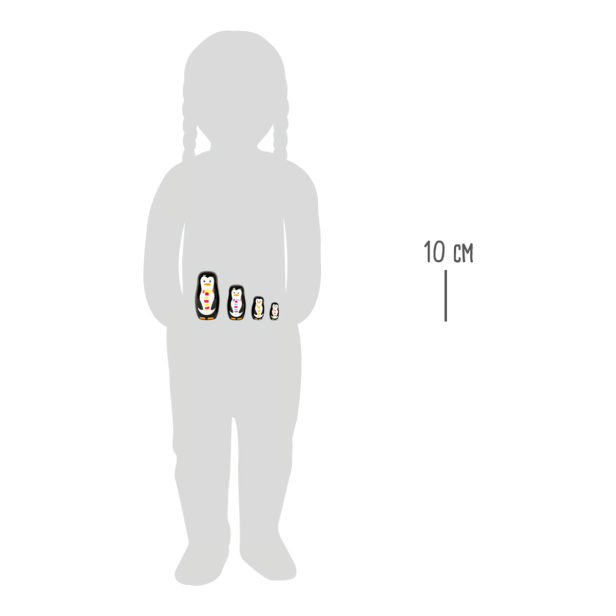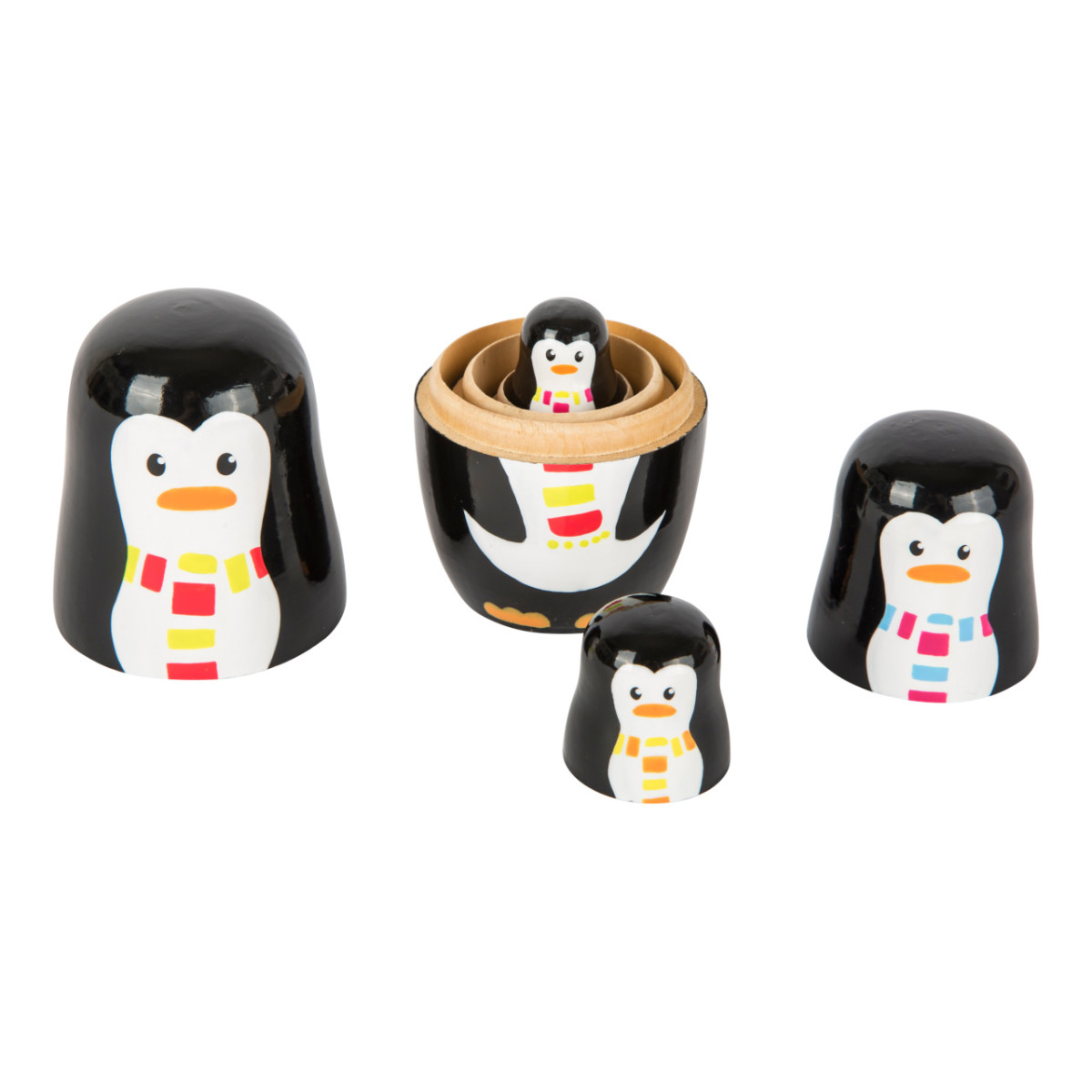 4 db fa pingvin figura egymásba helyezhető, részletes festéssel. Motorikus készségeket és szem-kéz koordinációt fejleszt.