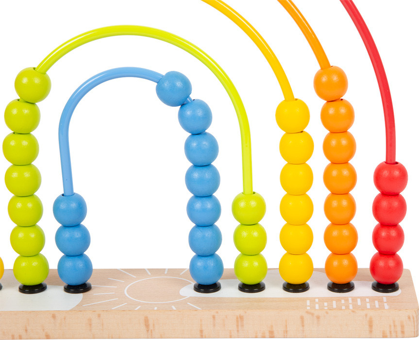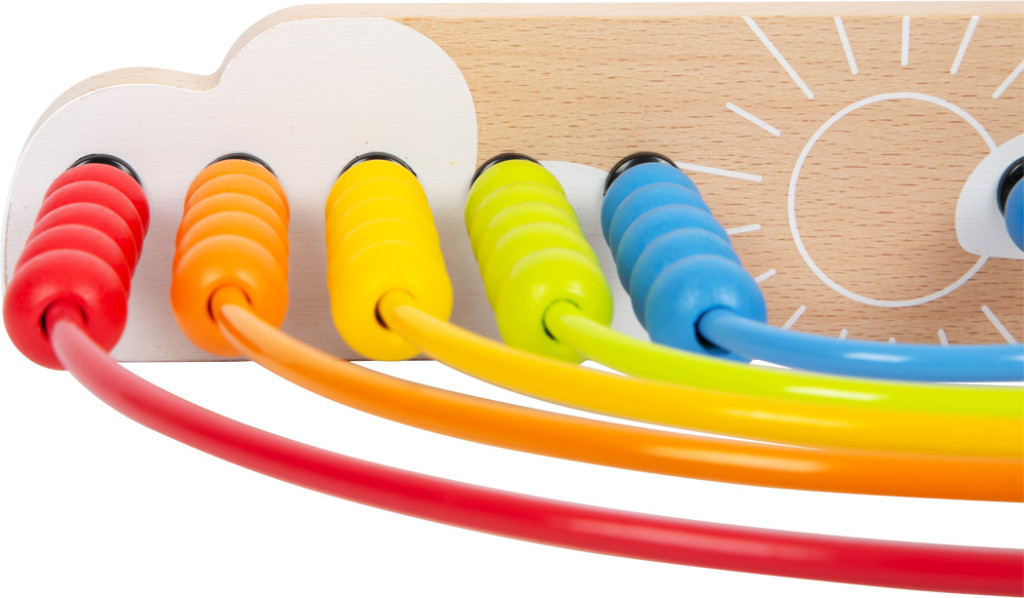 Színes gyöngy­labirintus öt fém pályával és 50 gyönggyel. A „esőcseppek” tologatása fejleszti a finommotorikát és az első mennyiség-/számfogalmat. Stabil fa talp; dekorként is mutatós.