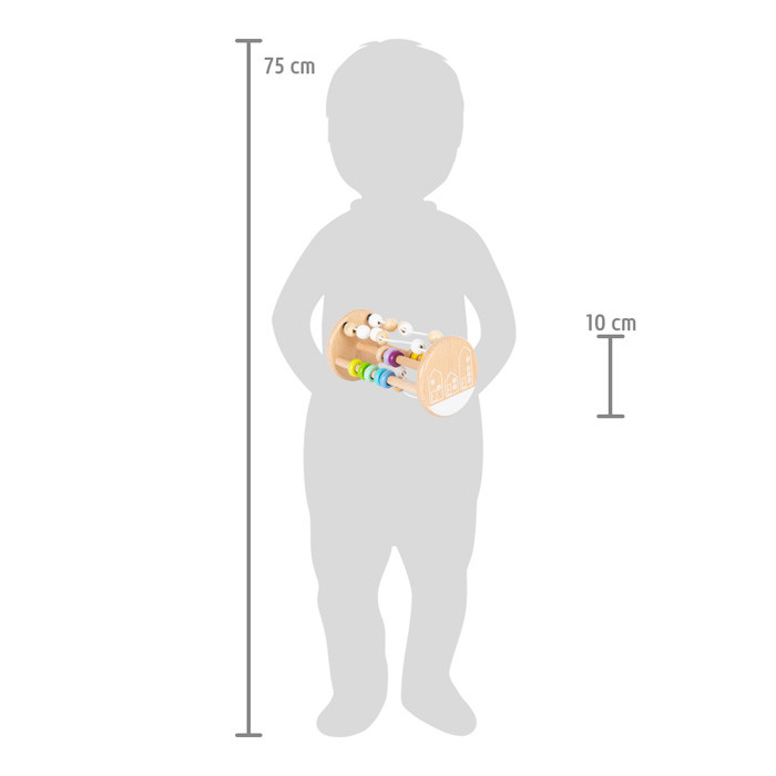 Színes fa gyöngyök három pályán, fa elemek ritmusos hangot adnak rázás közben. Motorikát és érzékelést fejlesztő játék kisgyerekeknek.