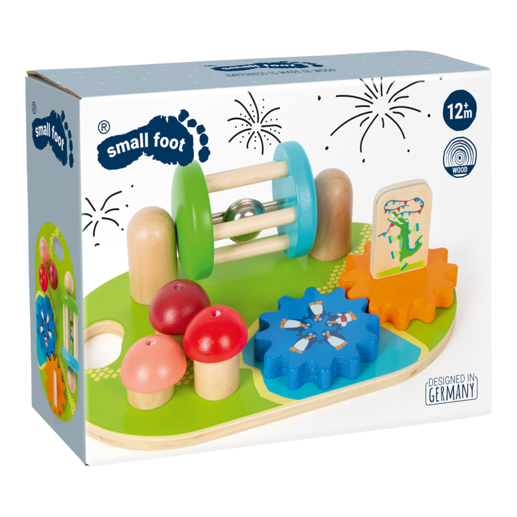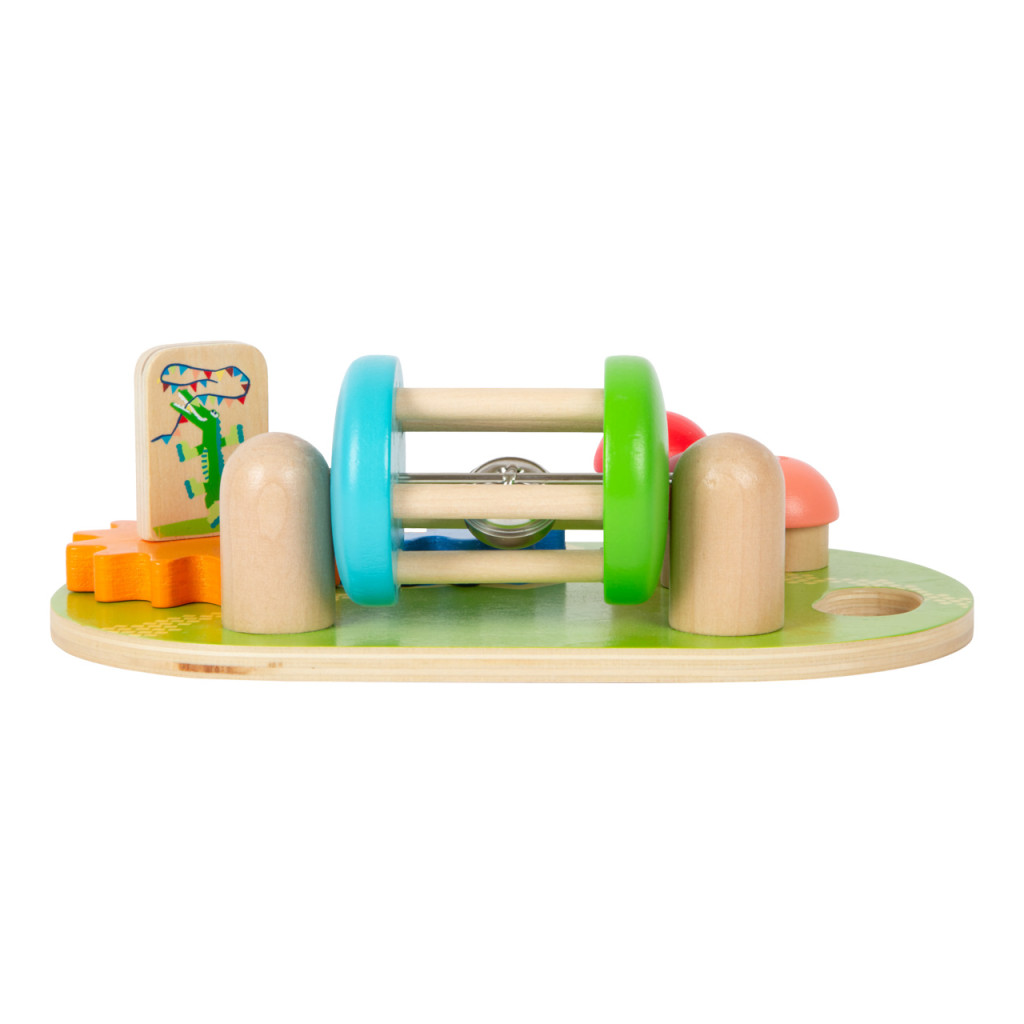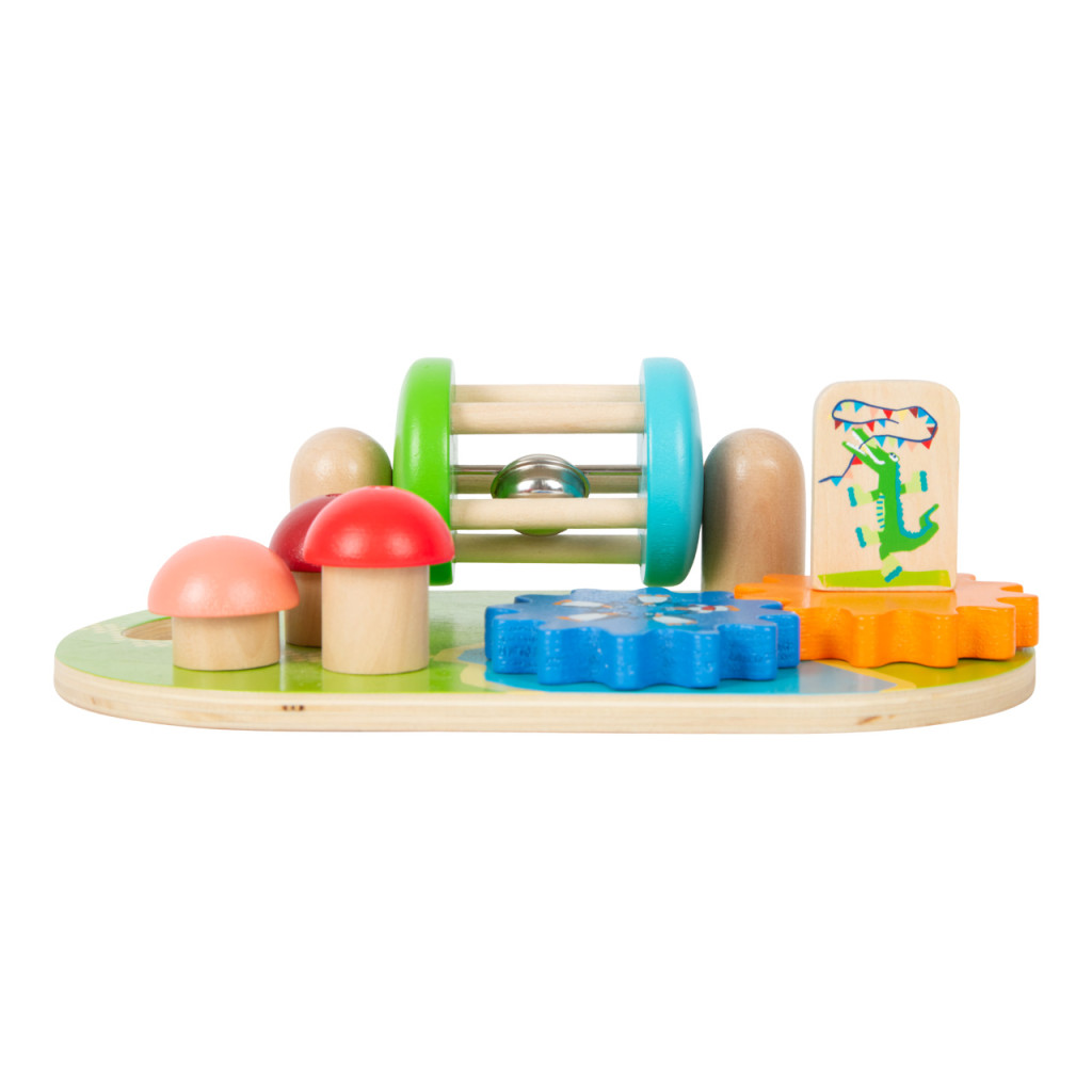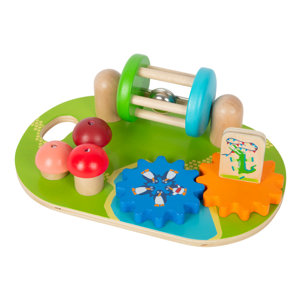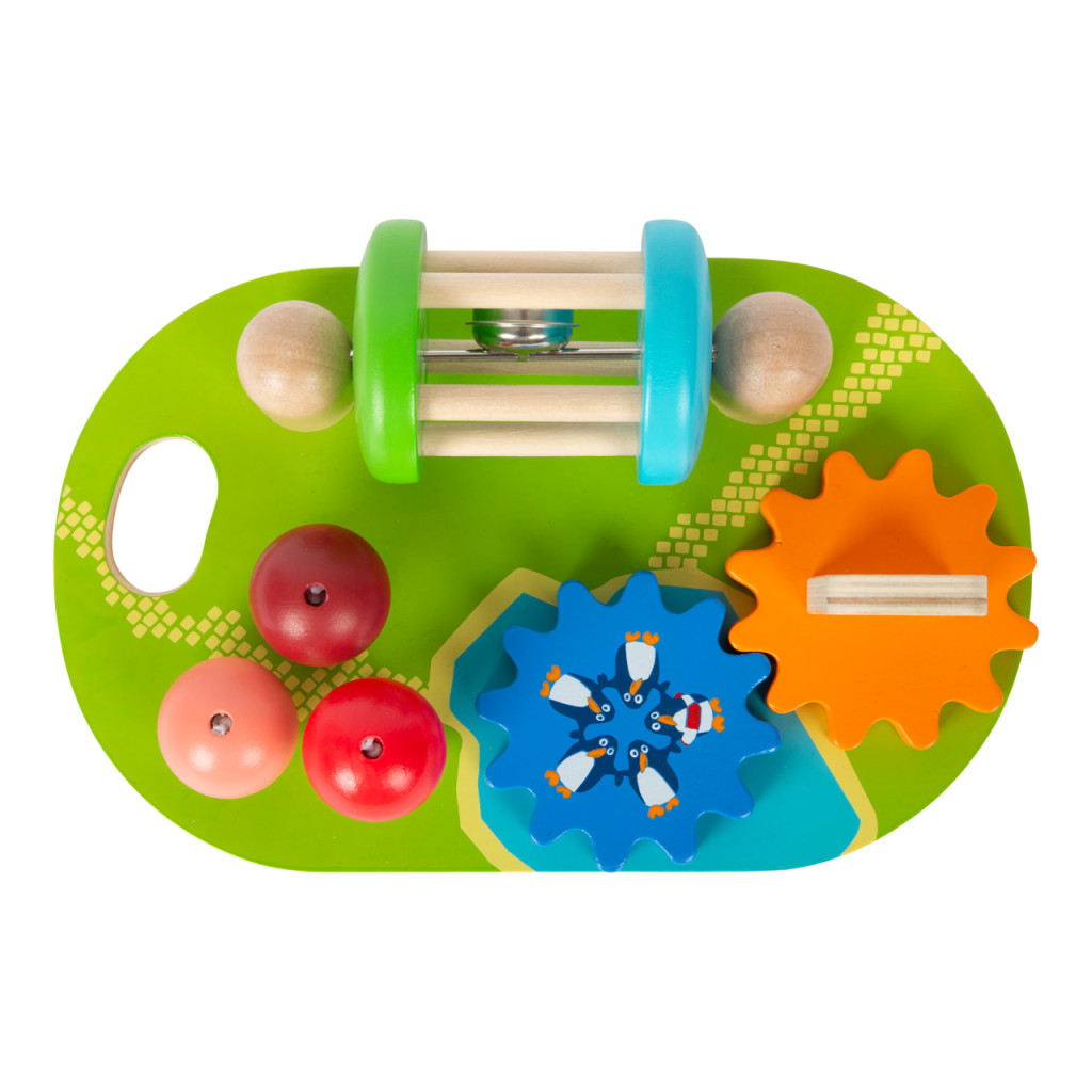 Színes, baba-barát fa fejlesztőtábla forgó csörgővel, fogaskerekekkel és gumipántos pöcögtető elemekkel. Laposan használható vagy a markolatnál vihető; markolást és koordinációt edz.