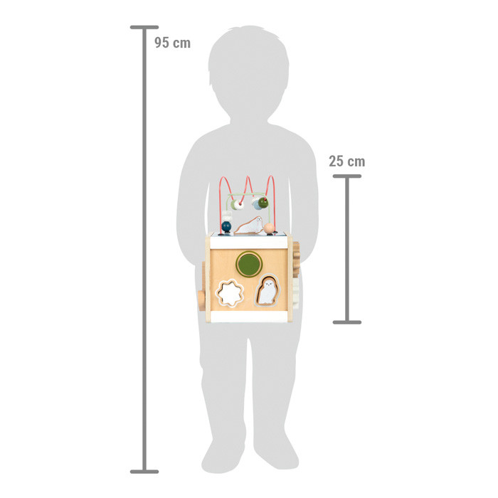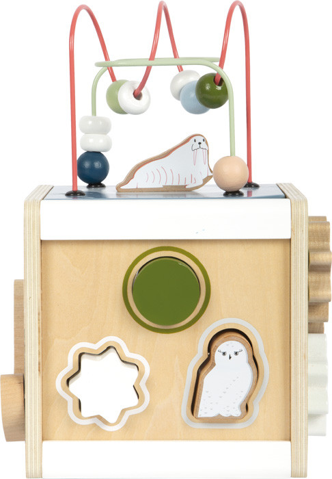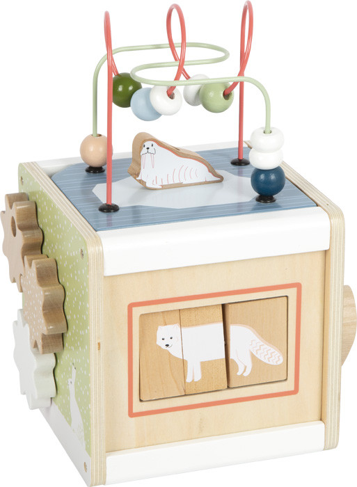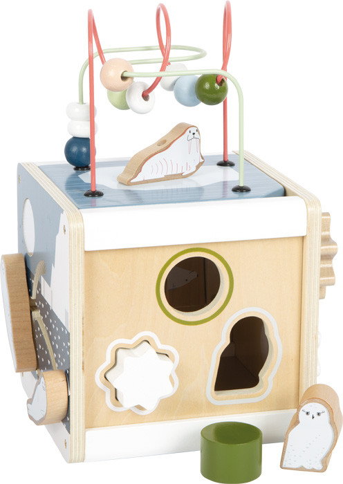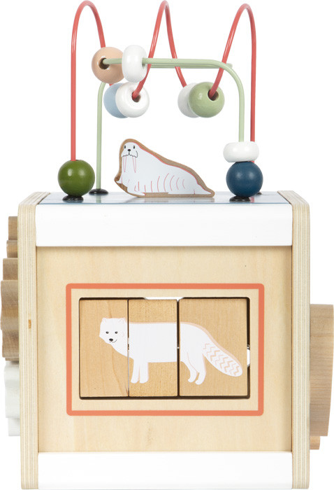 5 oldal: 2 gyöngyvezető, formabedobó, csúszka-labirintus, forgólapok és fogaskerekek. Levehető, belül tárolható tető; lekerekített élek. Motorika, szín/forma-felismerés, ok-okozat tanulása.