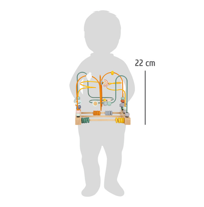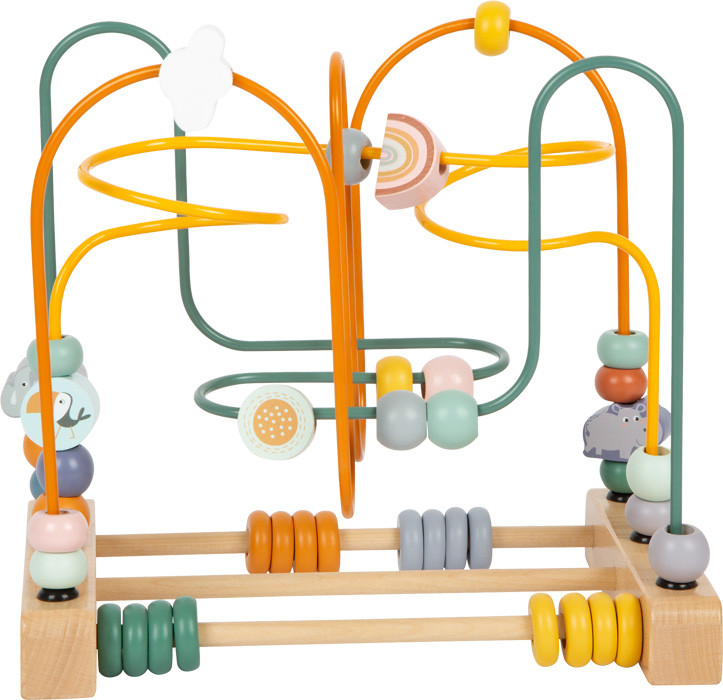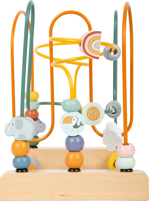 Három pályás, modern safari dizájnú klasszikus golyóvezető aranyos állatokkal. Finommotorikát és kéz-szem koordinációt fejleszt. Plusz két pálca gyűrűkkel a tologatáshoz és számoláshoz.