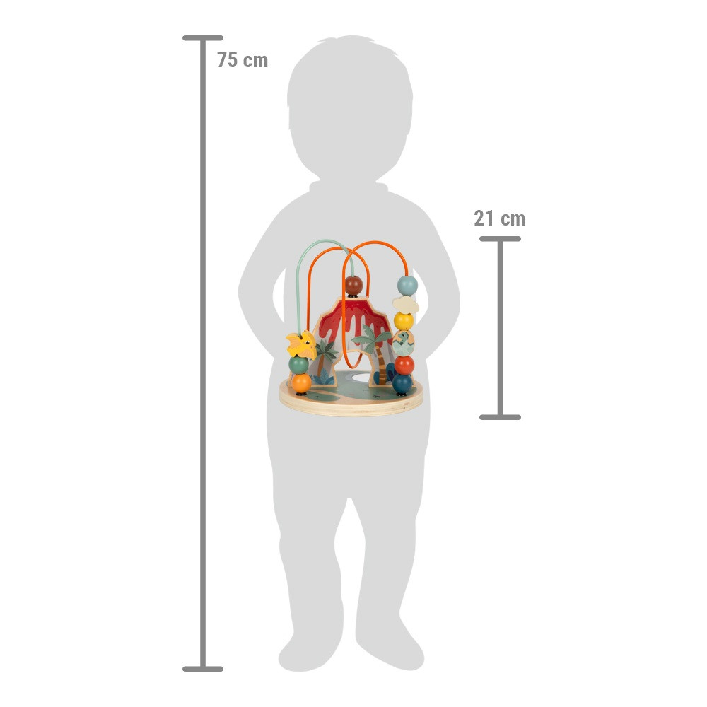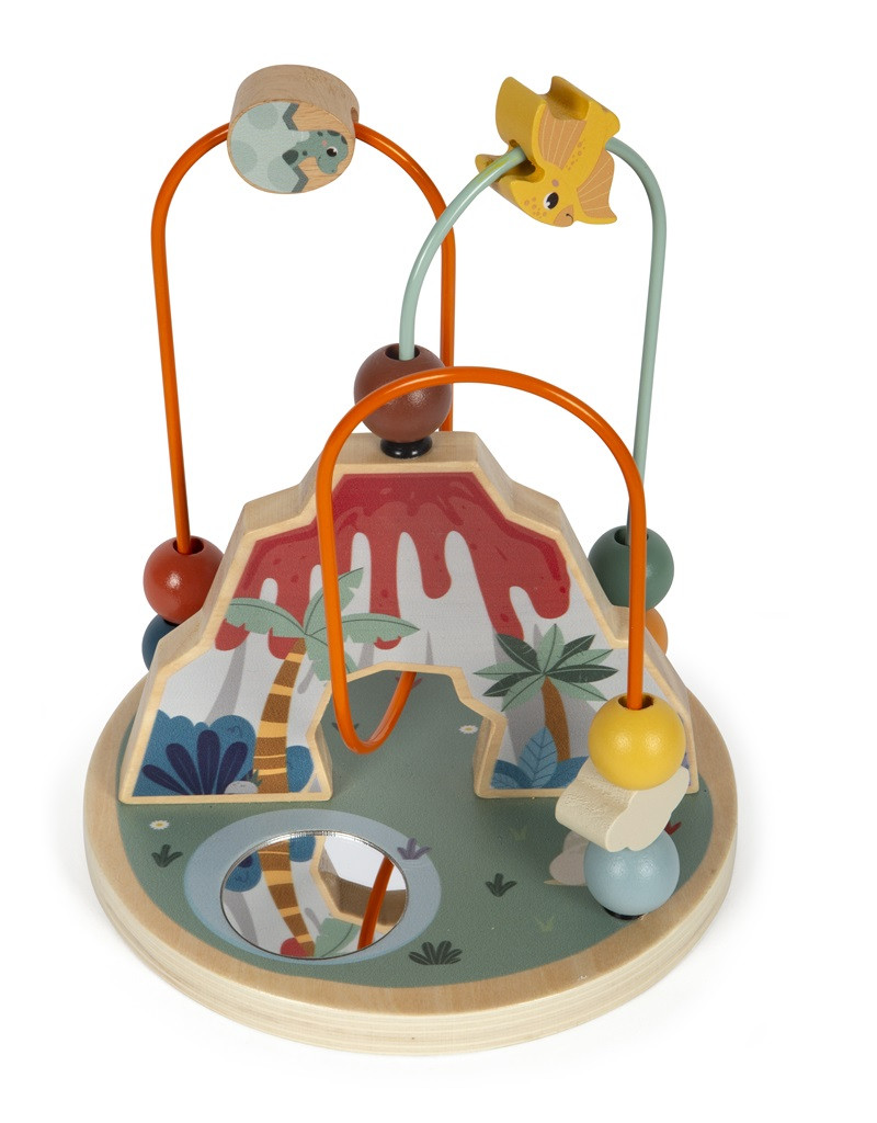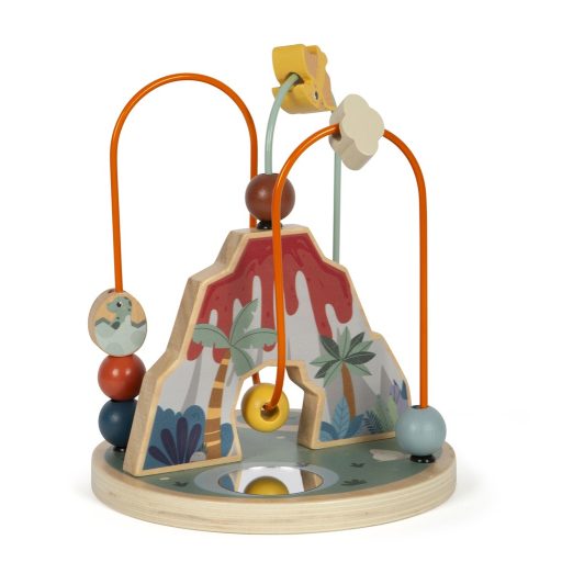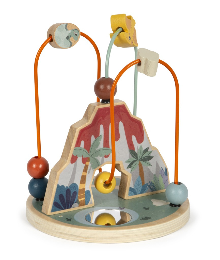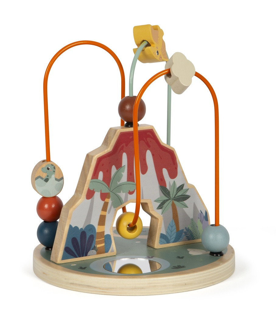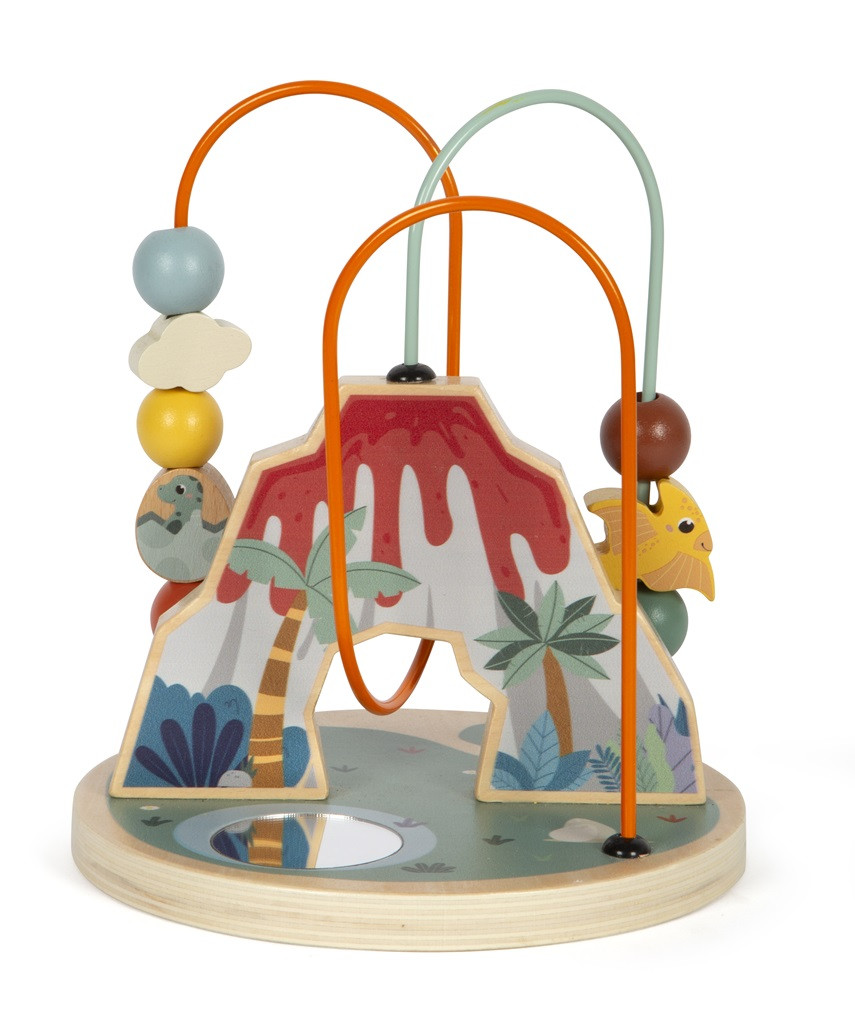 Részletgazdag vulkán-talpon két fémhurkon futó fa gyöngyökkel és két csúszkáló dínó elemmel, beépített tükörrel. Finommotorika és szem-kéz koordináció fejlesztésére, modern színvilággal - a dínórajongók kedvence.