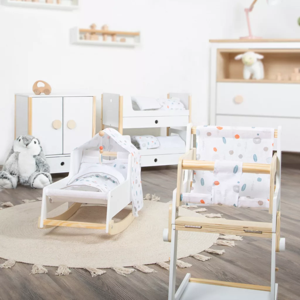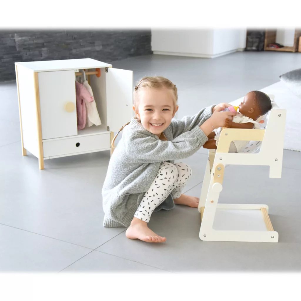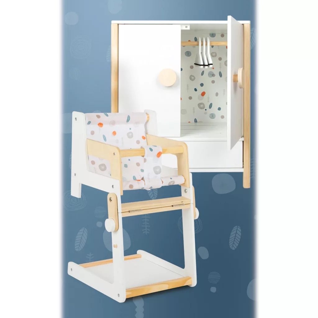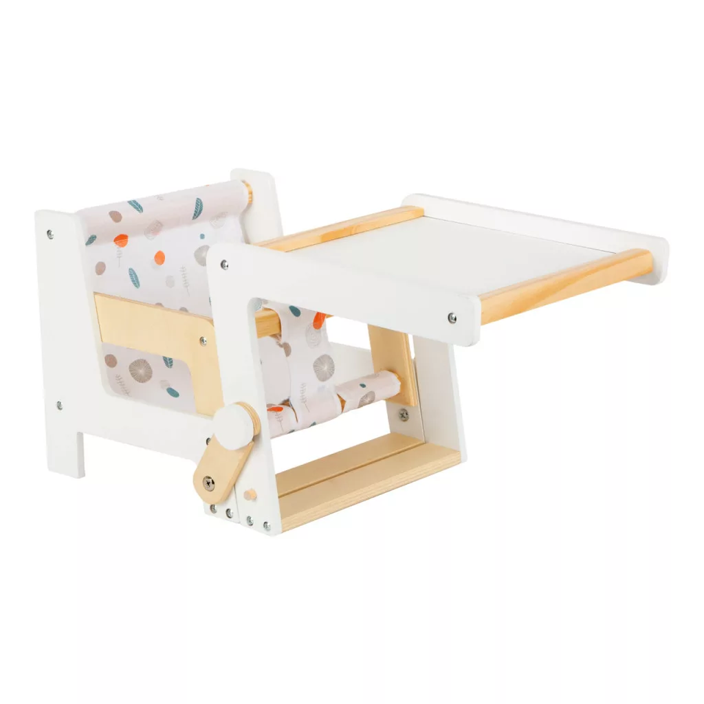 Sokoldalú, skandináv stílusú baba-etetőszék, amely néhány mozdulattal székké-asztallá alakítható. 46 cm-es babákhoz, lekerekített élek, jól látható fa elemek.