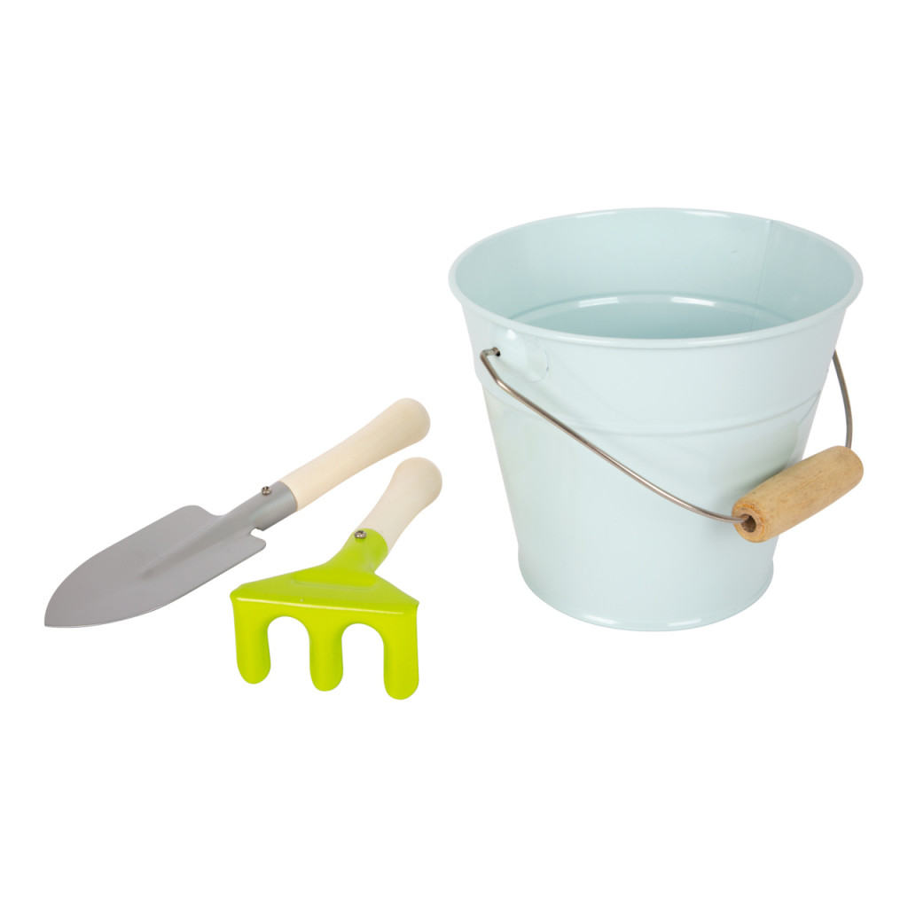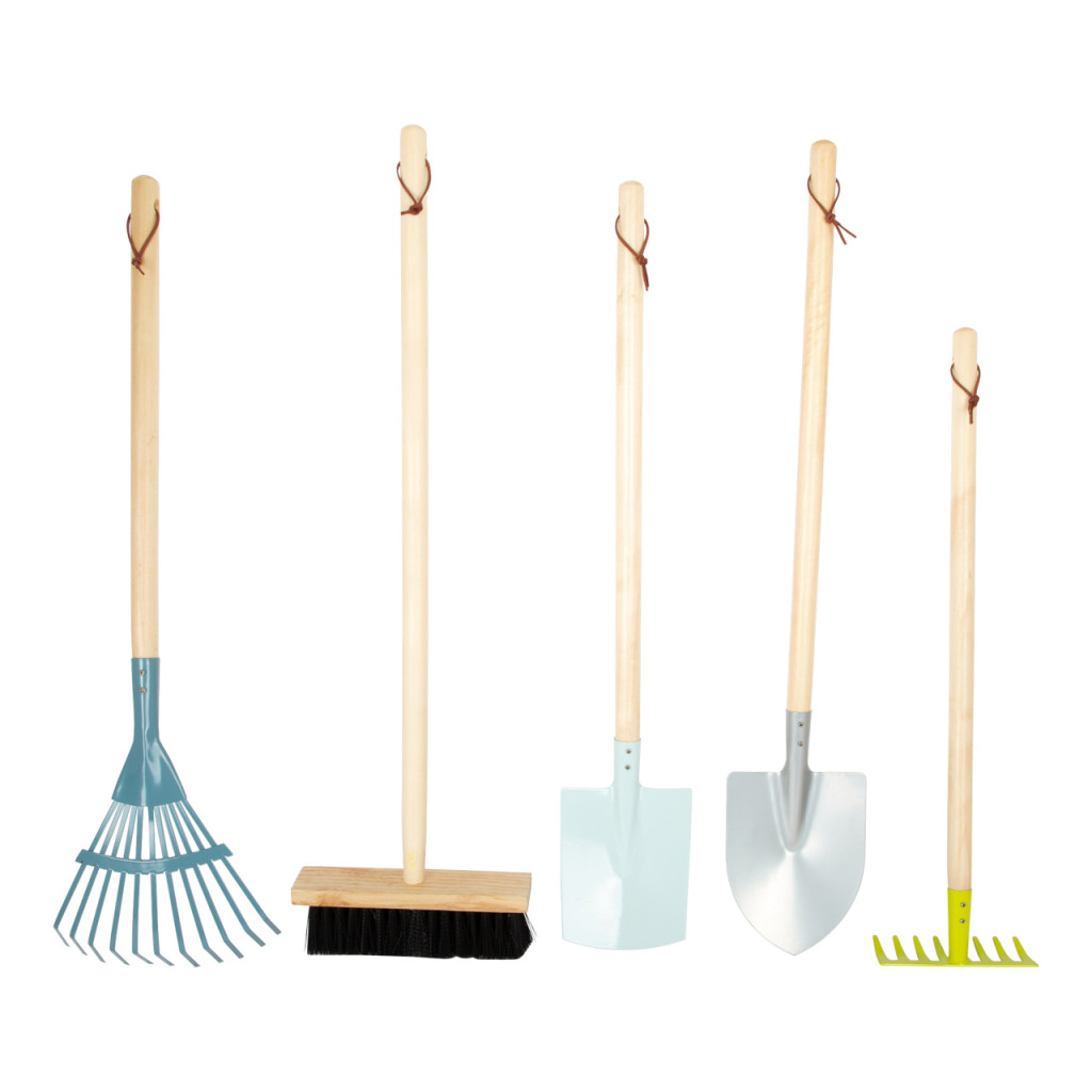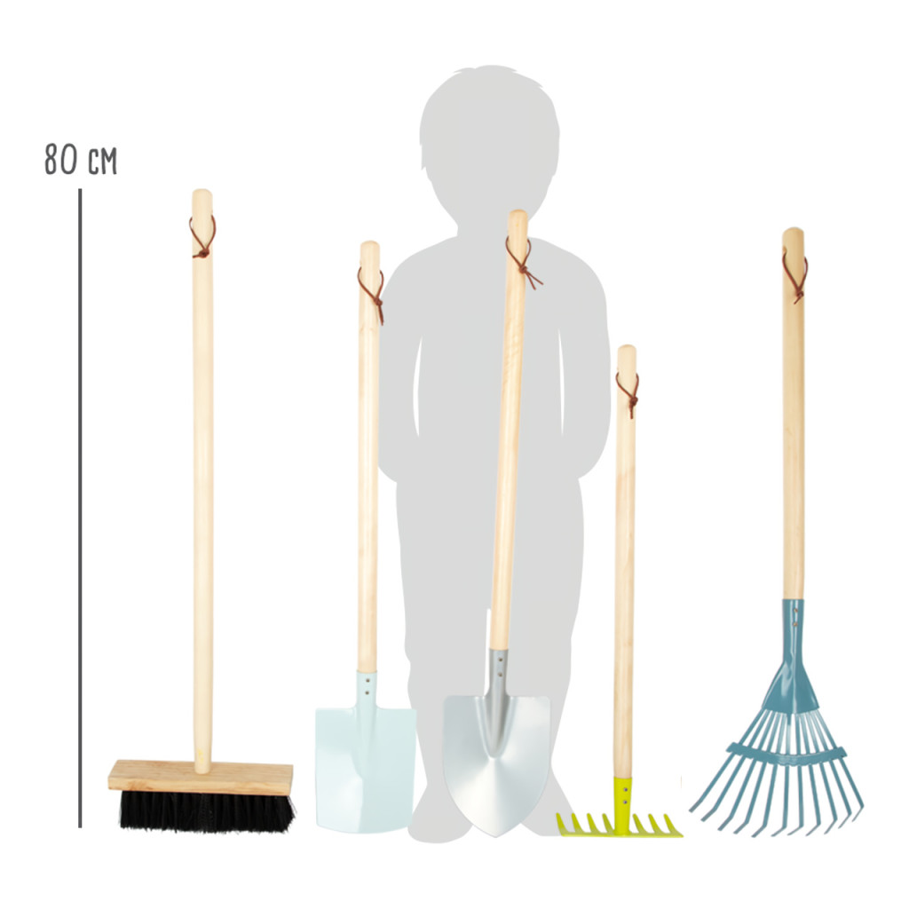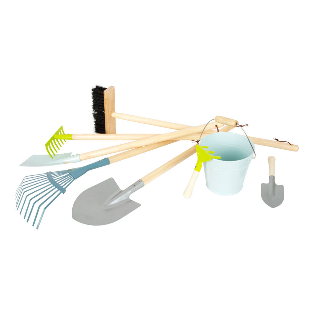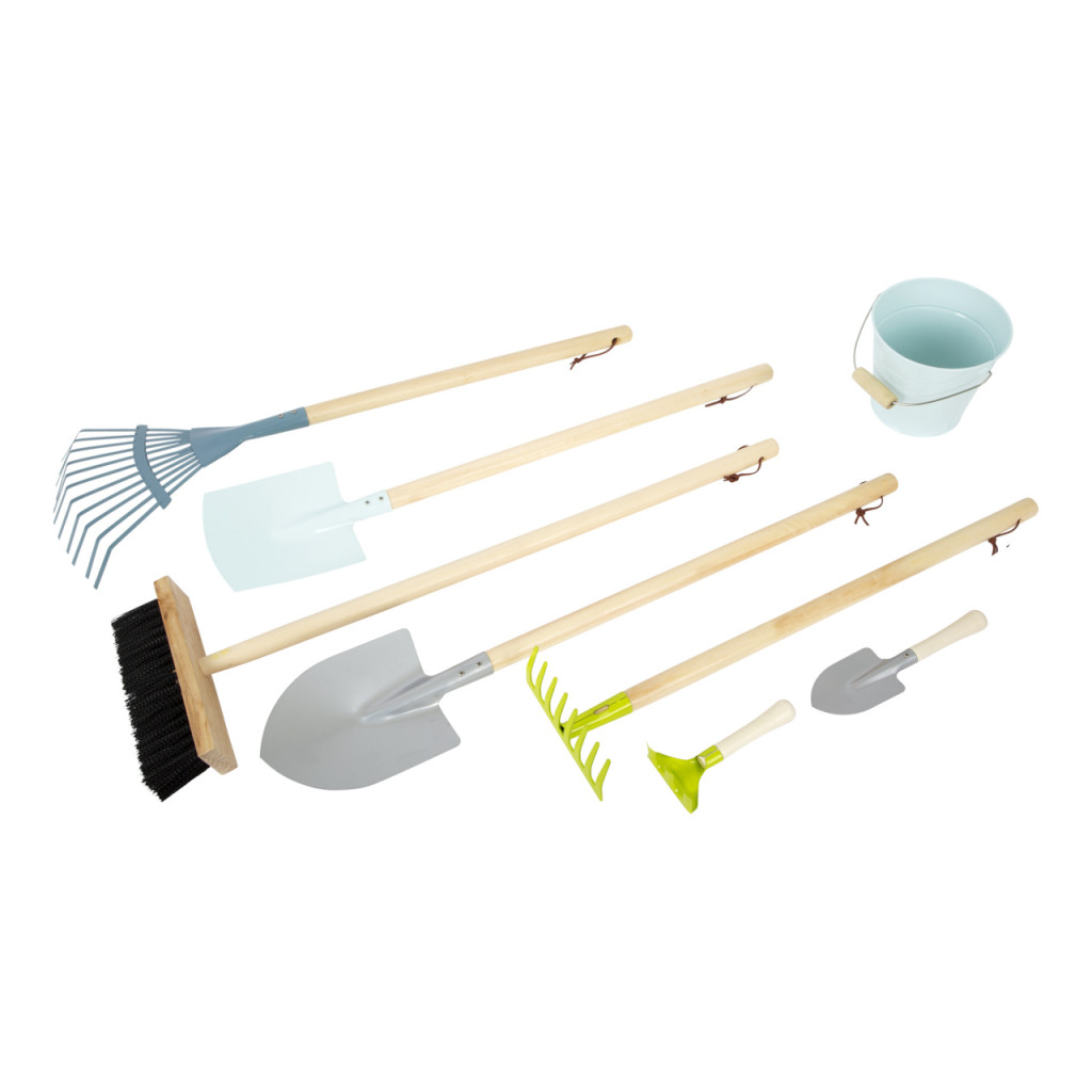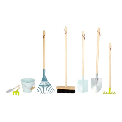Komplett készlet: ásó, lapát, gereblye, seprű, vödör és két kis kéziszerszám. Fából és fémből készült, modern színekben. Minden kis kertésznek nélkülözhetetlen, játékosan fejleszti a motorikát és a szerepjátékot. Praktikus akasztófülekkel.