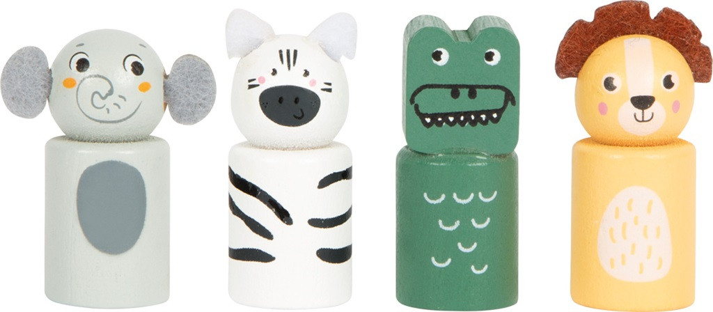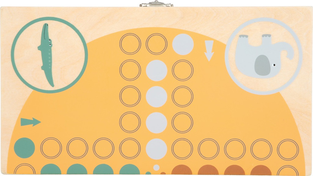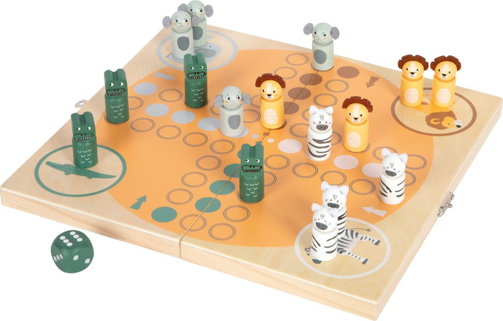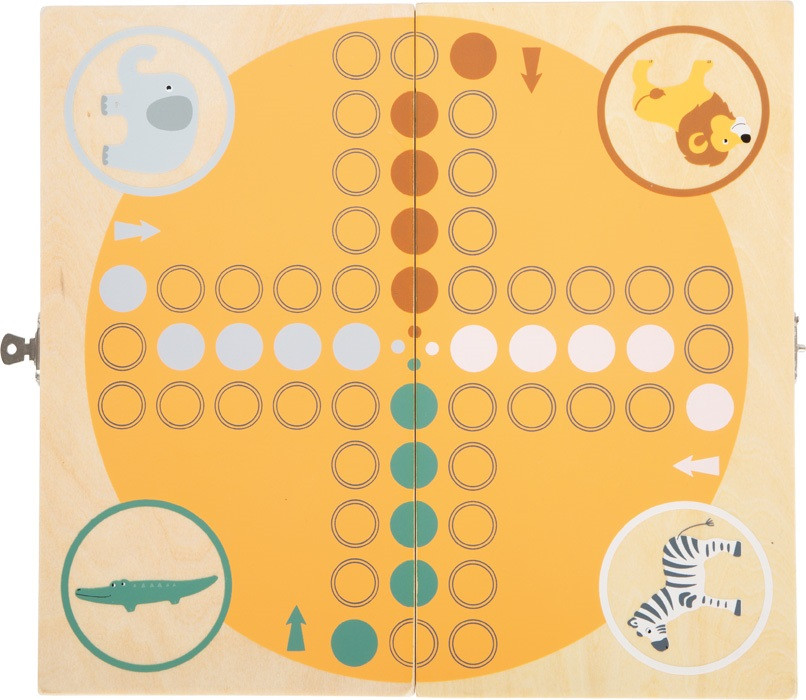 Időtlen társasjáték egzotikus köntösben! A négy játékosra tervezett készletben a bájos állatfigurák (zebra, krokodil, elefánt, oroszlán) filcfülekkel és sörénnyel díszítettek. Az összehajtható tábla játéktér és tárolódoboz egyben - utazáshoz is ideális. Számlálást, türelmet és finommotorikát fejleszt, közben igazi családegyesítő program. Tartós, szépen nyomtatott fa kivitel, modern színvilág, magas faanyag-tartalom.