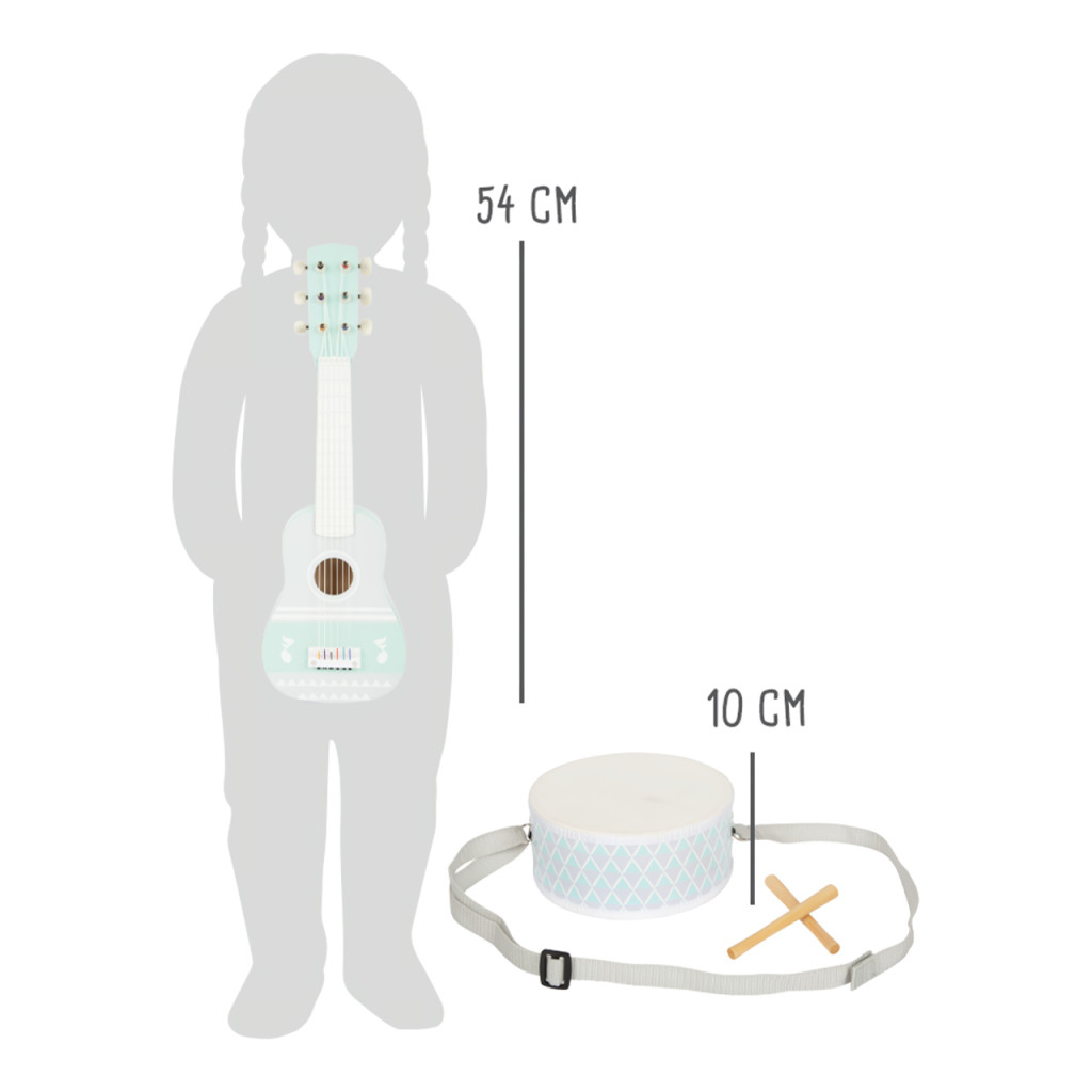 Gitár, xilofon és dob egységes pasztell dizájnban. Első zenei élményekhez; gitár- és xilofon kottával, igazi szobakoncert-hangulat.