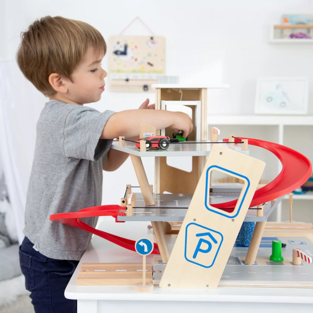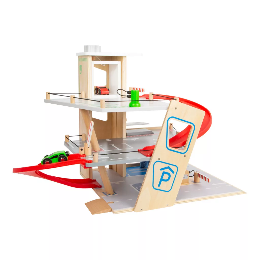 3 szintes garázs kézi csörlős lifttel, benzinkúttal/elektromos töltővel, mosóval, emelővel, helikopter leszállóval és 2 autóval. Stabil fa-műanyag kialakítás, hosszú játékérték.