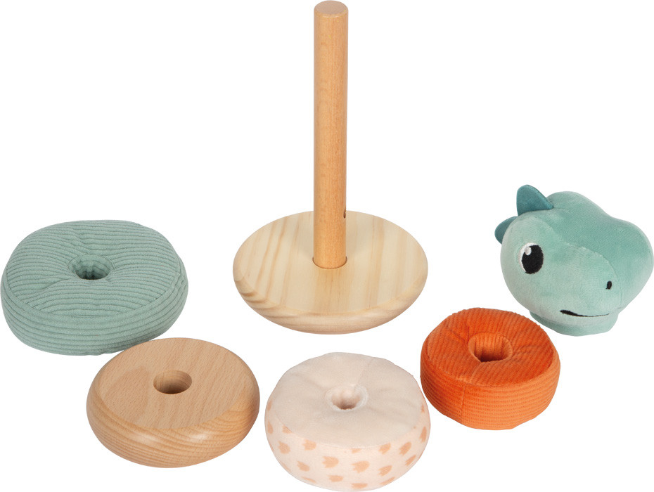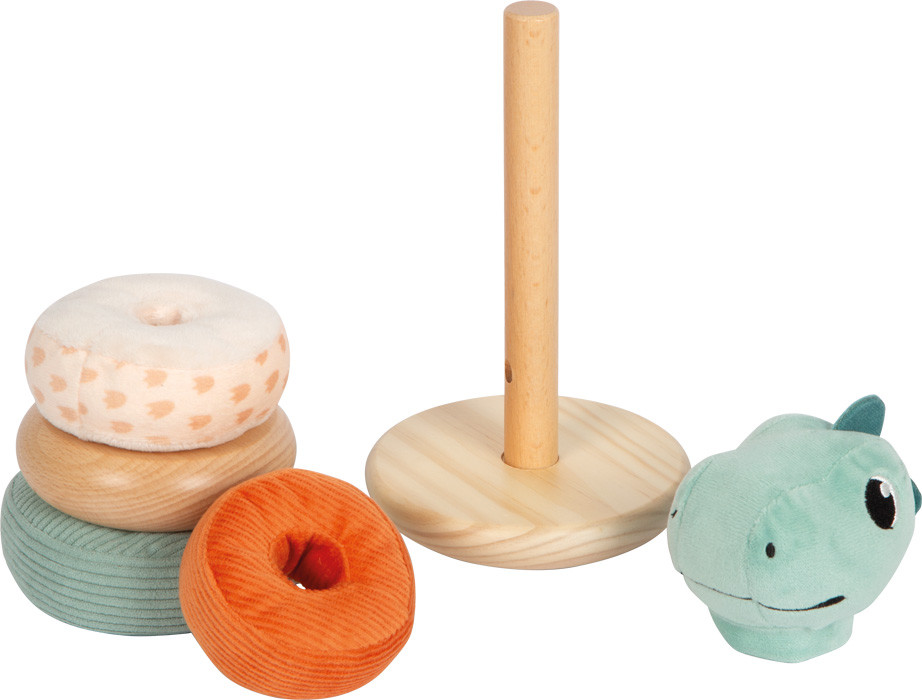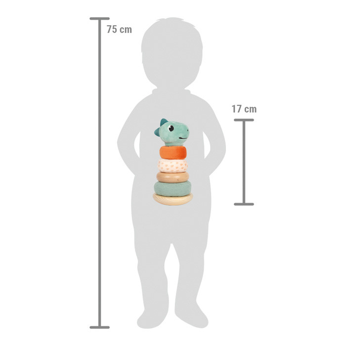 Vidám dínós billegő torony négy gyűrűvel (három textil, egy fa) és illeszthető fejjel. A puha és fa anyagok kombinációja kellemes tapintást és hosszan tartó játékélményt ad, miközben fejlődik a méret- és színfelismerés, a kézügyesség és a koncentráció. A rugalmas középrúd plusz biztonságot nyújt; modern színeivel a gyerekszoba cuki dísze.