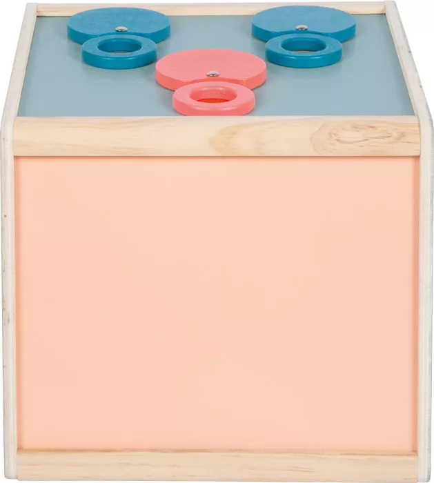 Nagyméretű fa érzékelődoboz két oldalsó ujjas nyílással. Kivehető nagyító-, kaleidoszkóp- és piros lencse; felül pillangónyílás, hátul mágneszáras ajtó a tárgyakhoz. Fényszabályozás, mosható mandzsetták. 1-9 játékosnak, vizuális/olfaktórikus/tapintási játékokhoz.