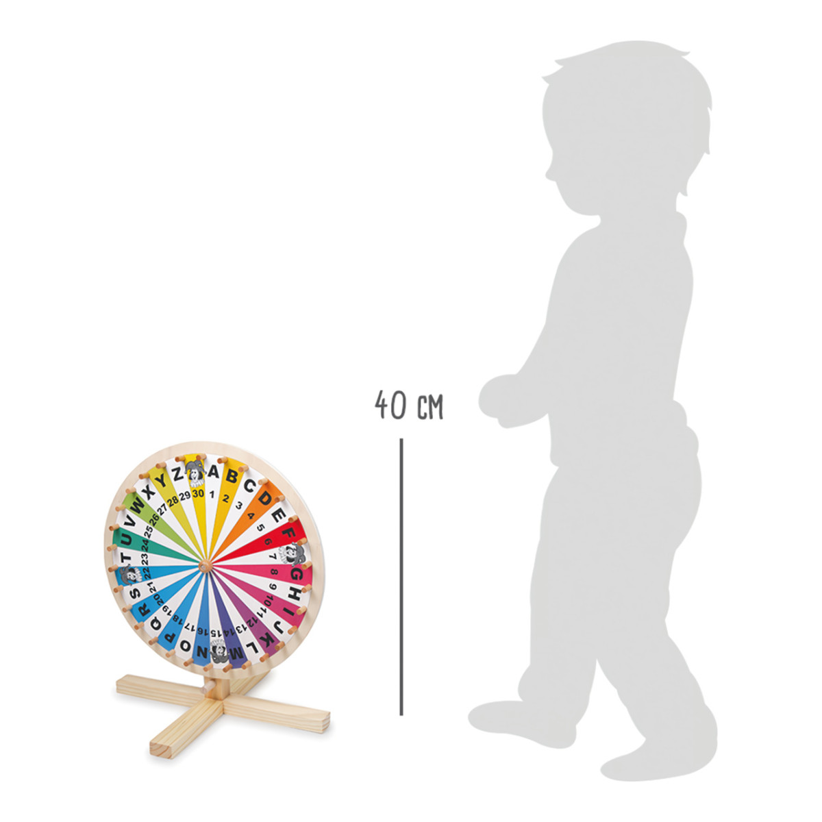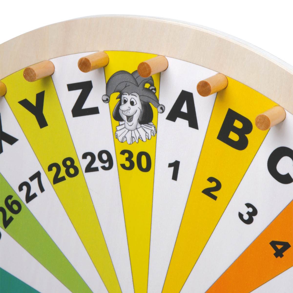 Ez a fa szerencsekerék remek kiegészítő tombolához, szójátékokhoz vagy saját kitalált játékokhoz! A kerék 1-től 30-ig számozott, betűkkel A-tól Z-ig és 4 jokerrel. Stabil fa állványon forog, a mezők kis faütközőkkel vannak ellátva, amelyek vicces hangot adnak, amikor a „megállítót” elérik.