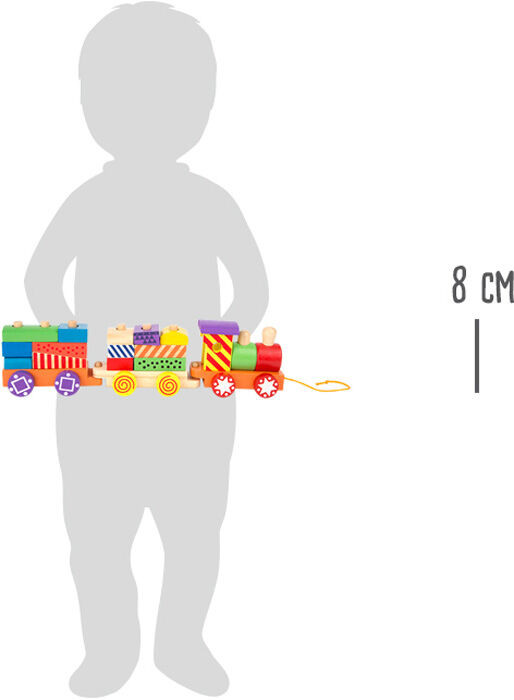 A színes fa vonatkészlet izgalmas szórakozást kínál a gyerekeknek. A mozdonyhoz két kocsi kapcsolódik, amelyeket egy zsinórral lehet húzni. A színes, mintás fa kockák variálhatók és újrarendezhetők, így a vonat mindig más-más megjelenést kap. Ez a játék fejleszti a kézügyességet, a formafelismerést és a kreativitást, miközben a kicsik szerepjátékban is kipróbálhatják magukat. Strapabíró, vidám és tanulást segítő játék.