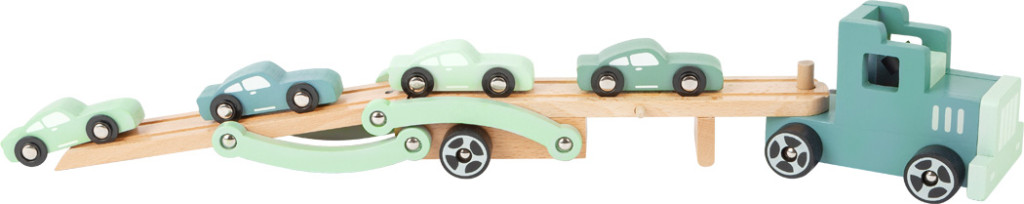 Nagyméretű, természetes fából készült kamion „blue steel” színvilággal. Felhajtható felső rámpa, 4 sportautóval. Masszív, hosszan tartó játék.