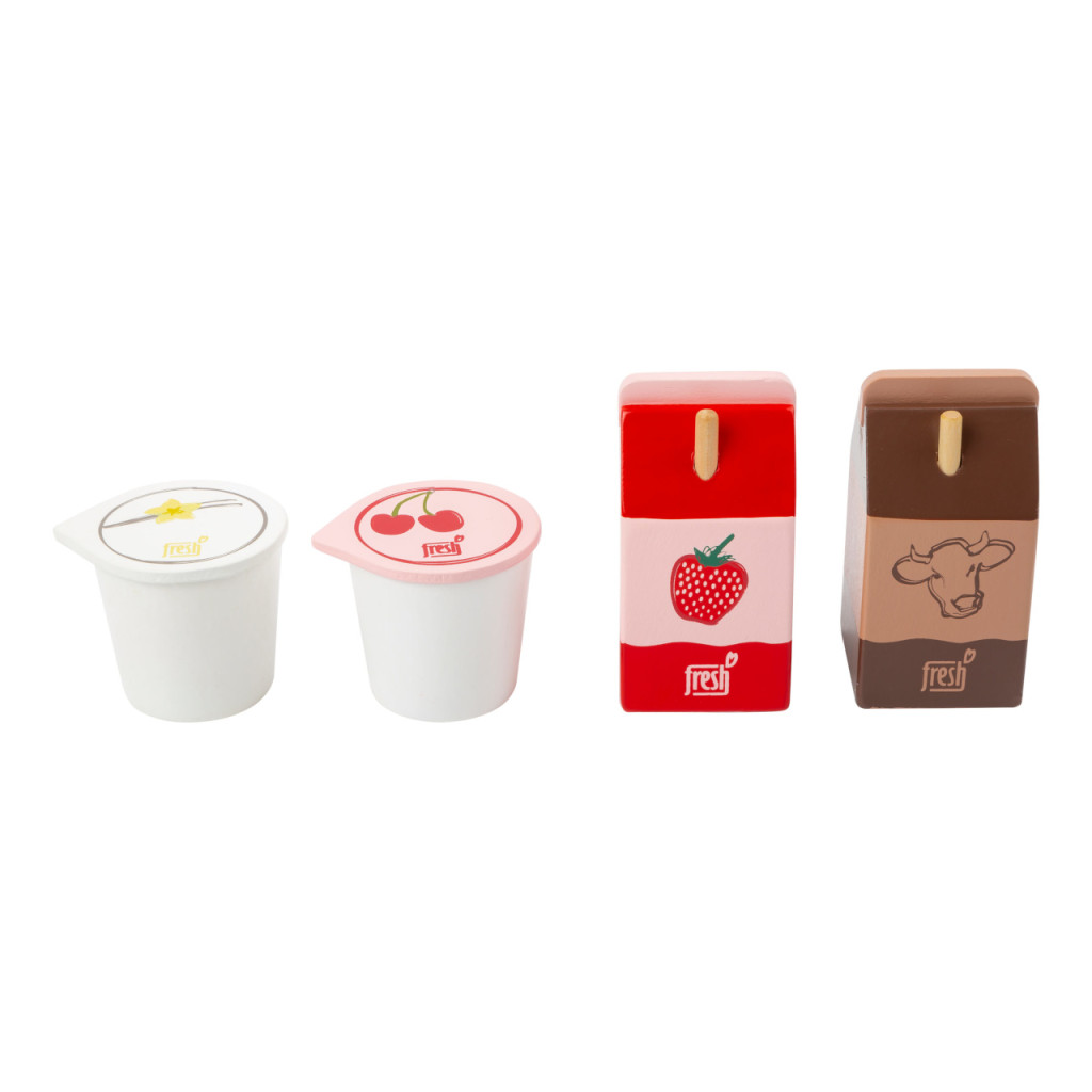 4 darab fa tejtermék: epertej, kakaó szívószállal, cseresznye és vanília ízű joghurt. Valósághű megjelenés, tartós fa alapanyag. Konyhába és boltos játékhoz ideális.