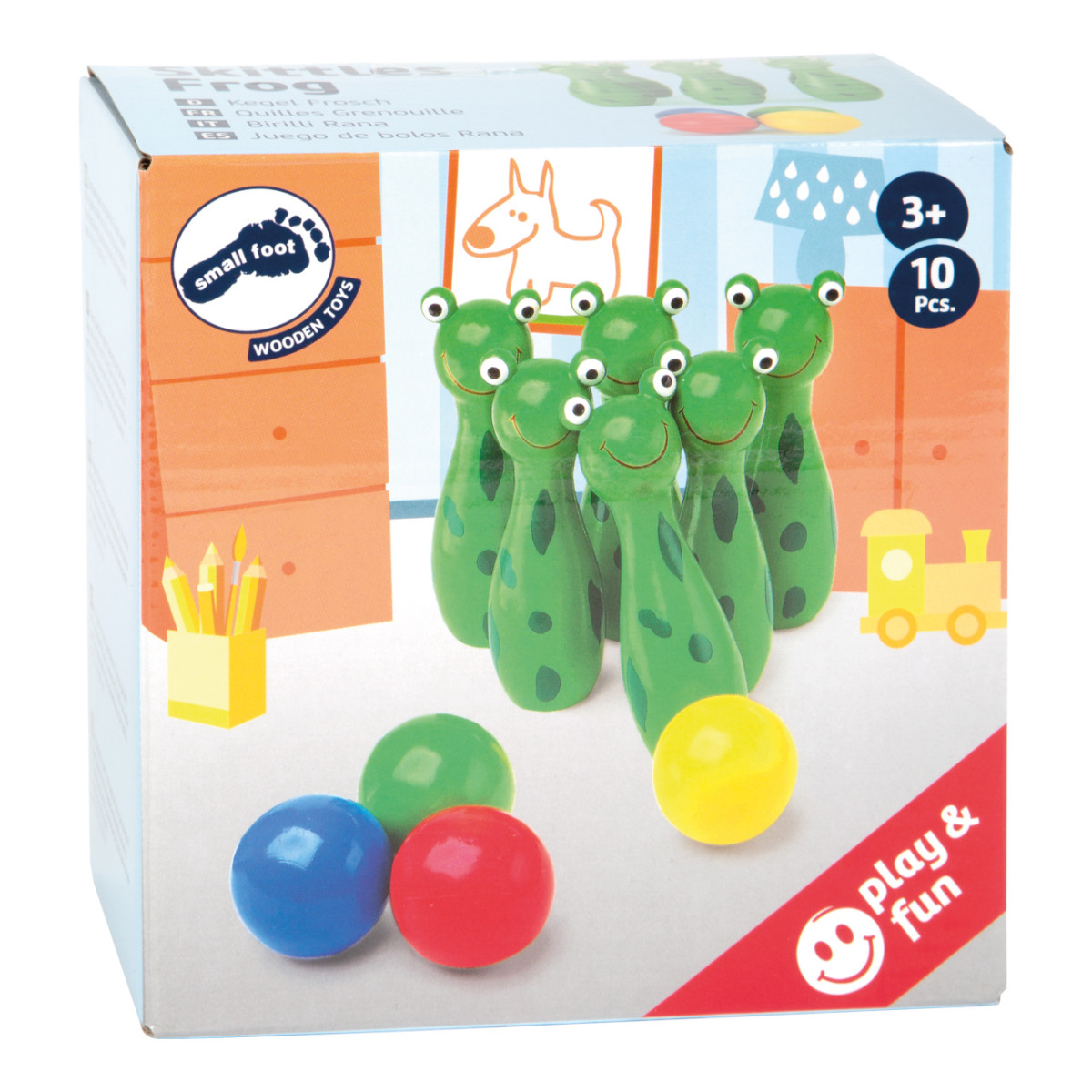 Ez a különleges fa teke játék vidám béka formájú bábukkal biztosít rengeteg szórakozást. A kompakt méretnek köszönhetően kis helyen is elfér, mégis izgalmas kihívást nyújt a gyerekeknek. A játék fejleszti a kézügyességet, a koncentrációt és a célzást, miközben jókedvű perceket teremt. A vicces, gülüszemű békák garantáltan elvarázsolják a legkisebbeket is, akik örömmel próbálják majd újra és újra felállítani és ledönteni őket.