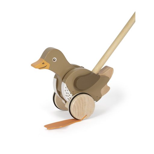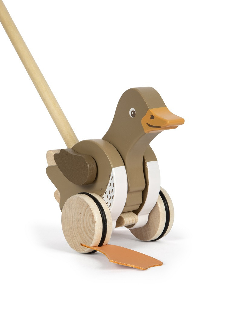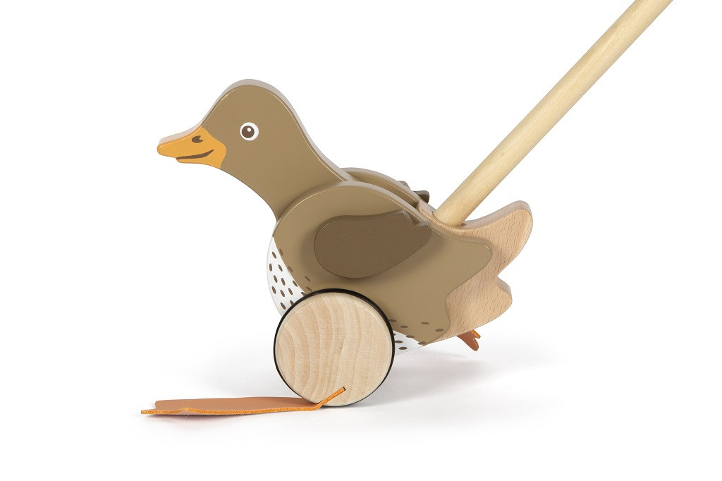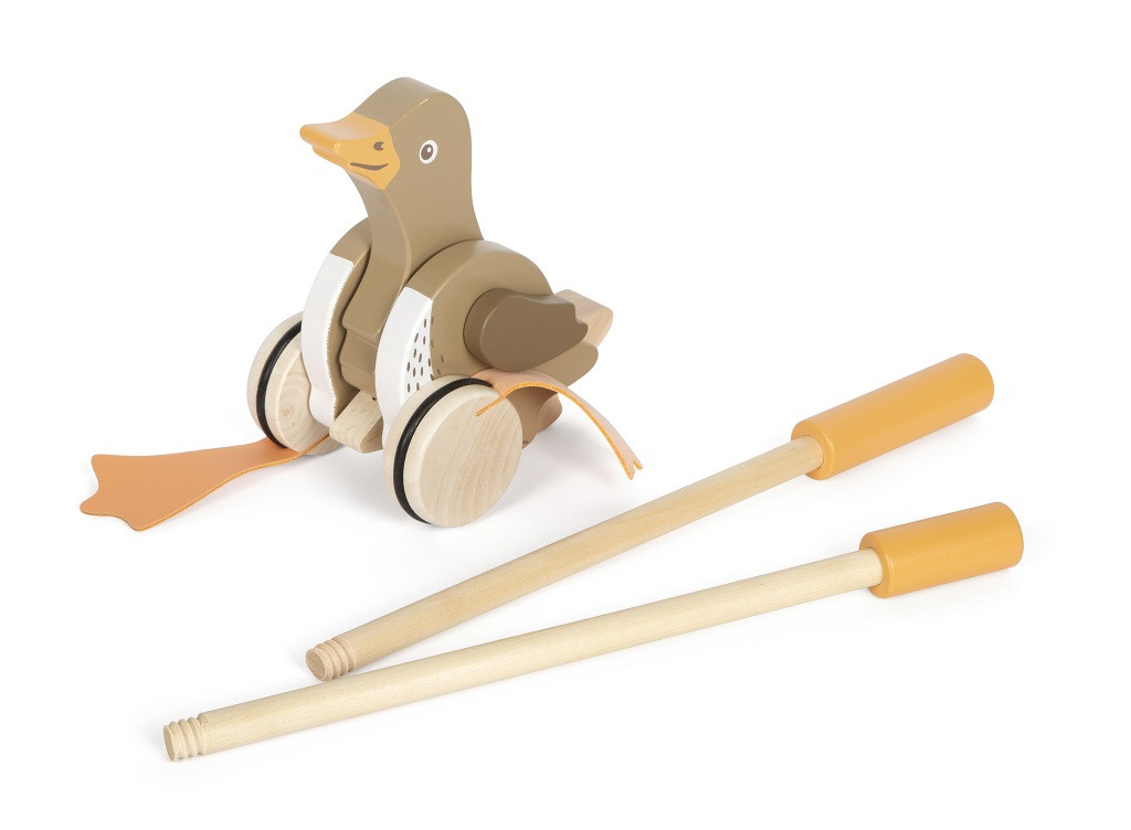 FSC® 100% fa. Mozgó fej és szárnyak, billegő lábak hanggal, gumírozott kerekek, két részes tolórúd.