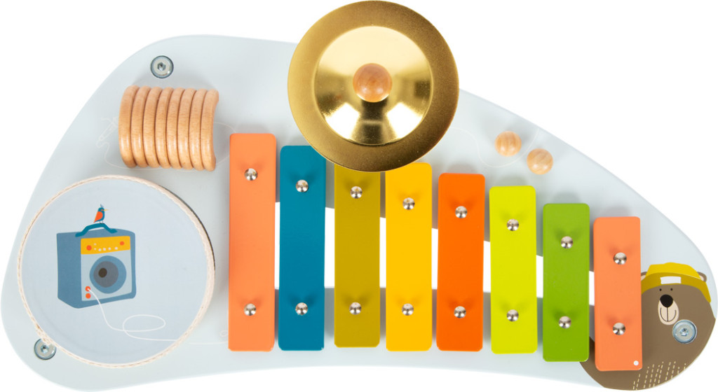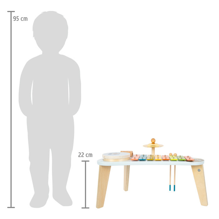 Masszív, háromlábas fa zenélőasztal cintányérral, xilofonnal, csörgővel és levehető dobbal. Színkódolt hanglécek, erős fa ütők és kotta. Ritmus-, hallás- és hangfelismerés-fejlesztő egyben.
