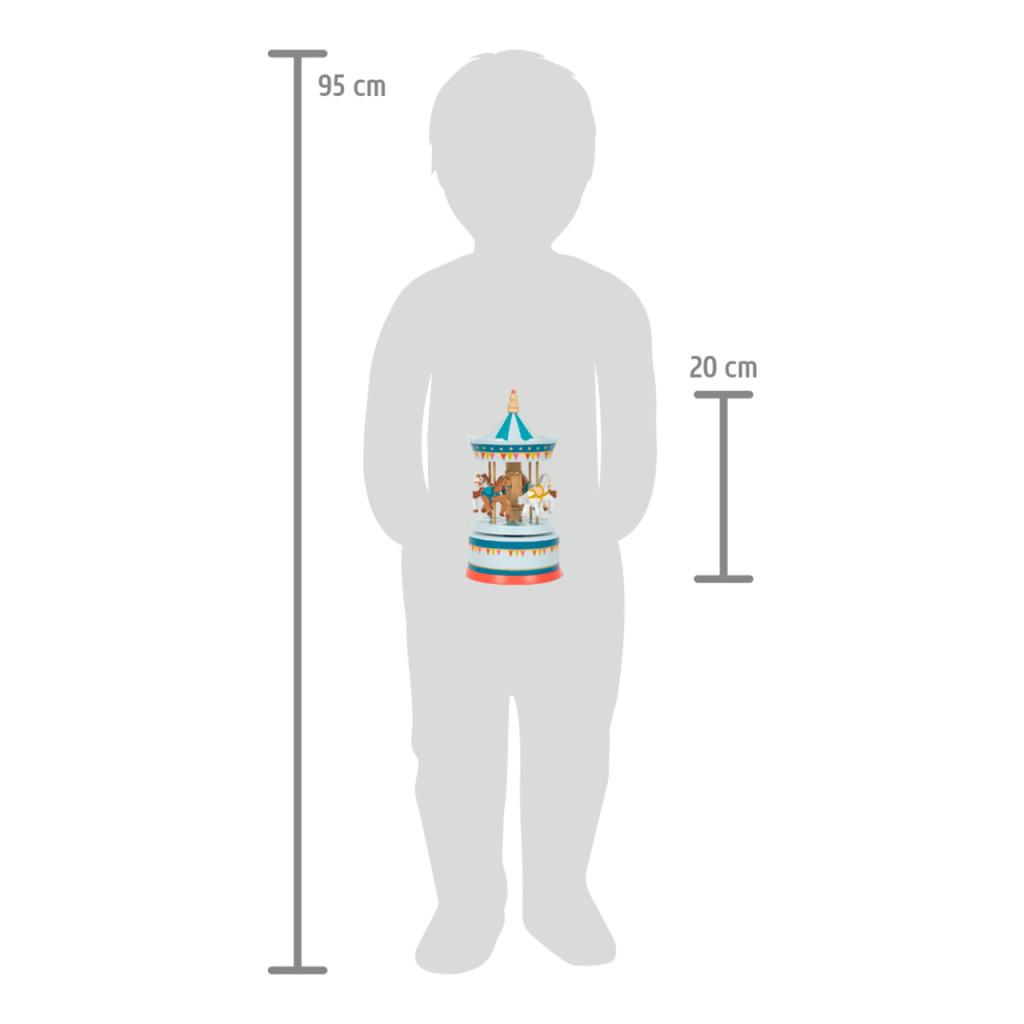 Klasszikus körhinta kinézetű zenedoboz fa lovacskákkal. Beethoven „Für Elise” dallamát játssza; a részletgazdag, arany díszítésű fa design igazi dísz a gyerekszobában. A gyerekek maguk is felhúzhatják.