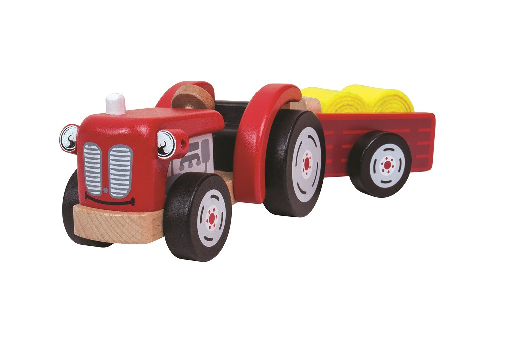 Tento pekný a drevený retro traktor s vlečkou pomôže s prepravou zvierat alebo obilia. Má polohovateľne predné svetlá a príves s otočným závesom. Tiež obsahuje dva balíky sena. Keď deti balíky vyložia ponúkne sa im veľa miesta pre všetky ich zvieratá (niesu súčasťou balenia). Traktor s prívesom má zaoblené kraje, rohy a kolesá a je tak ideálny pre malé ruky. Podporuje detskú kreativitu a predstavivosť. Rozvíja koordináciu ruka-oko a jemnú motoriku. Vyrobené z kvalitných materiálov z zodpovedných zdrojov. Zodpovedá európskej bezpečnostnej norme. Postavička nieje súčasťou balenia, je možné ju dokúpiť v našej ponuke.  Hlavné vlastnosti: polohovateľne predné svetlá príves s otočným závesom obsahuje dva balíky sena podporuje detskú kreativitu a predstavivosť