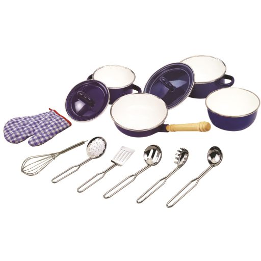 Mladí nastávajúci kuchári iste toto vybavenie kuchyne ocenia. Set o 13 kusoch obsahuje 3 smaltované hrnce a panvicu; 3 typy naberačiek, obracačku, metličku a chňapku. Všetek riad bol zmenšeny, aby s ním mohli dobre pracovať aj malé detské ruky. Skvelý spôsob ako deti naučiť variť rôzne jedlá a dodržiavať bezpečnosť v kuchyni. Podporuje kreatívnú a predstavivú hru. Rozvíja koordináciu ruka-oko, jemnú motoriku a zručnosť. Zodpovedá európskej bezpečnostnej norme.  Hlavné vlastnosti: 13ks riadu podporuje kreatívnú a predstavivú hru rozvíja koordináciu ruka-oko, jemnú motoriku a zručnosť