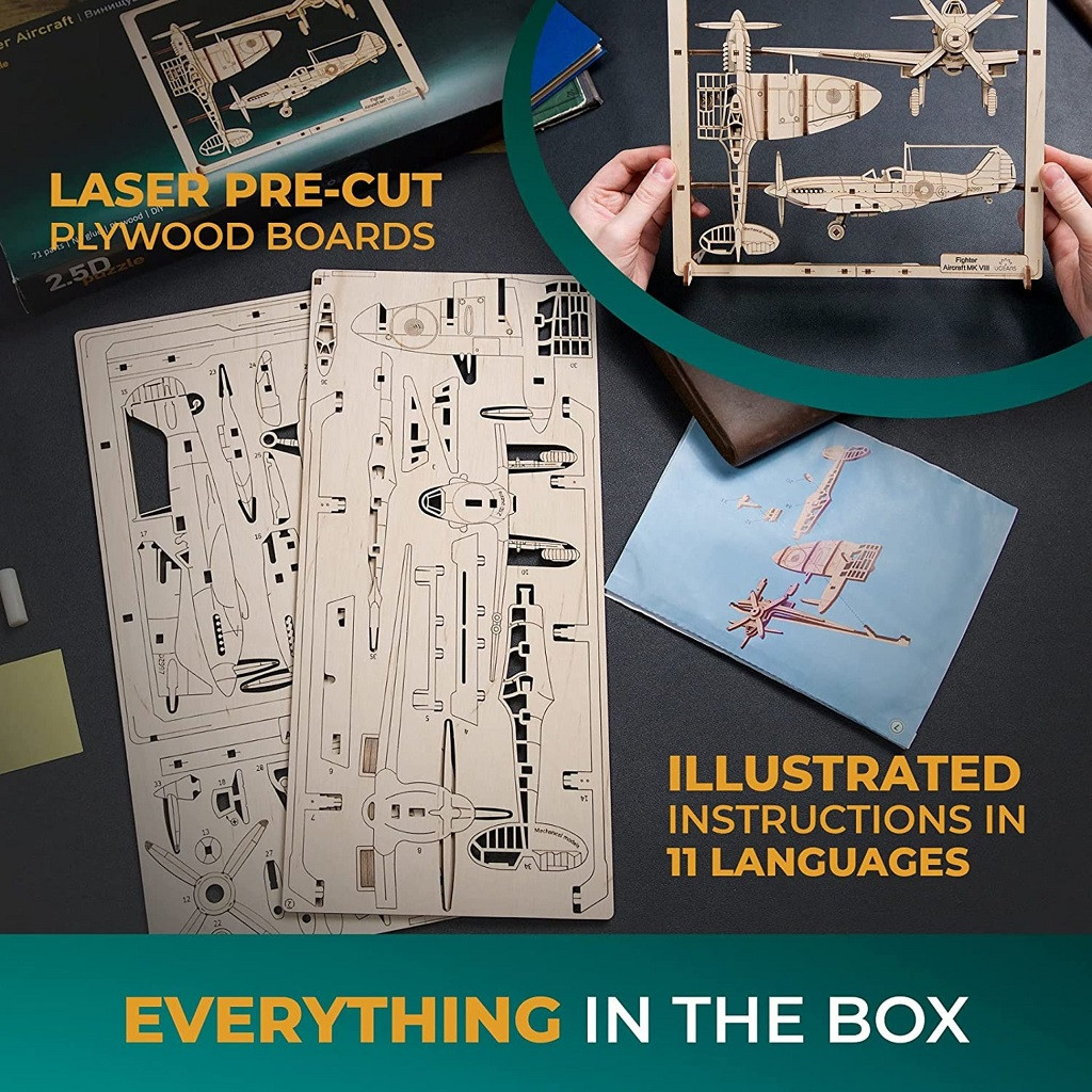 A legendás Spitfire előtt tisztelgő 2,5D modell három perspektívában mutatja a gépet, miközben apró mozgó elemek (propeller, kormányfelületek, futó részletei) hozzák mozgásba a képet. A saját fakeret falra akasztható, a mellékelt támasz pedig polcra állítható megjelenítést ad. 47 darab, kb. 30 perc, szerszám és ragasztó nélkül. Kezdőknek is sikerélmény, ugyanakkor elegáns dísz a repülés szerelmeseinek. Natúr fa, szabadon színezhető; kiváló ajándék gyereknek és felnőttnek.