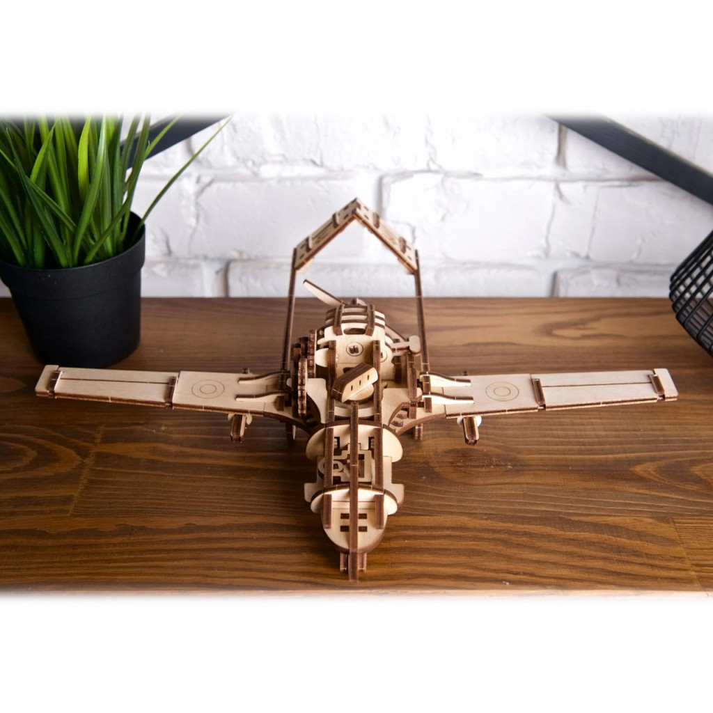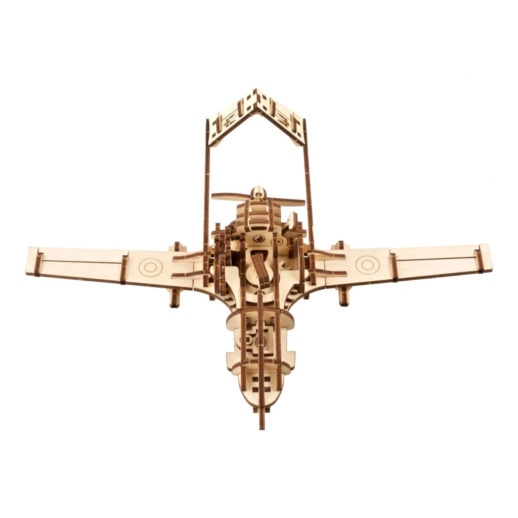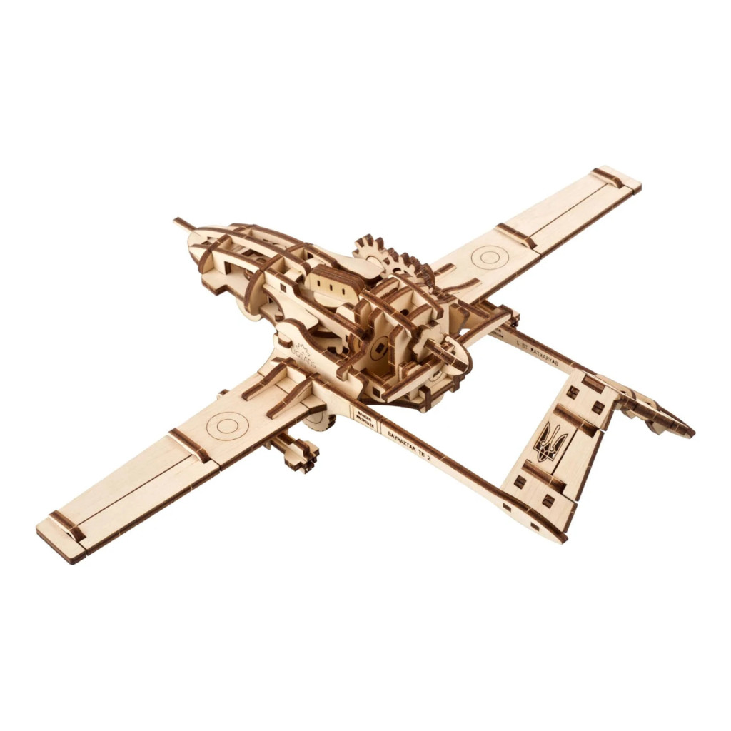 Nemzeti szimbólummá lett UAV működő miniatűrje: fémrugós felhúzómotor, oldalkarral indítható gurulás, forgó tolólégcsavar jellegzetes zümmögéssel. Átlátható fogaskerék-mechanika, mozgó kameragömb, állítható csűrő- és oldalkormány, leoldható „rakéták”. 125 precíz elem, közepes nehézség; a modell önjáró sík felületen. Részletes útmutató, ukrajnai gyártás.