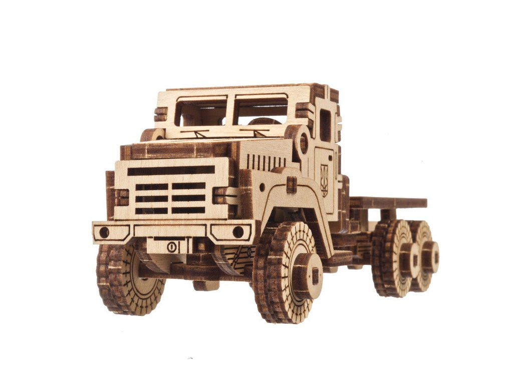 Masszív, mégis gyorsan építhető háromtengelyes terepjáró teherautó 91 darabbal. A kerekek fordulnak, a motorház nyitható, a kabin oldalán lézergravírozott ukrán címer díszít. A modell kormányozható, saját rugómotorjával önjáró, így kis mérete ellenére „munkára fogható”. Kezdőknek is jó sikerélmény, festve még karakteresebb. Asztali dísz és játék egyben – az a fajta apró gép, amit az ember óhatatlanul tologat egy kicsit, valahányszor ránéz.