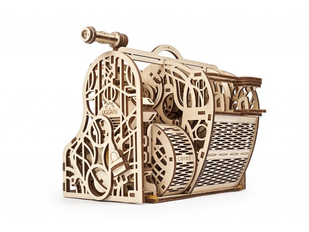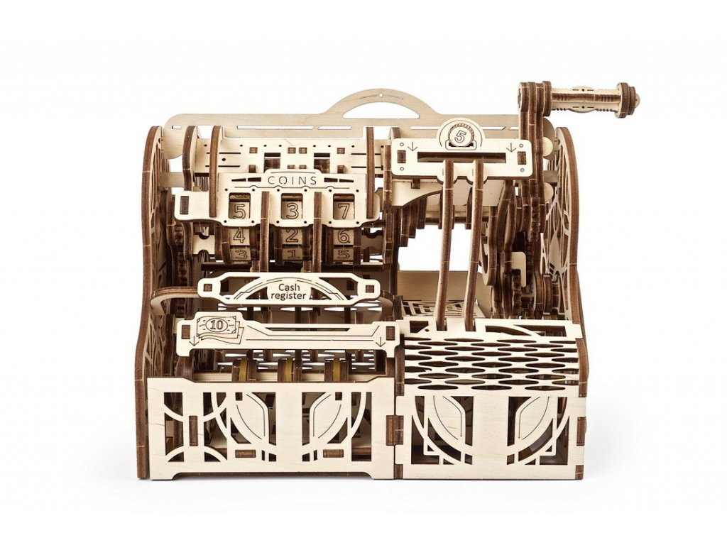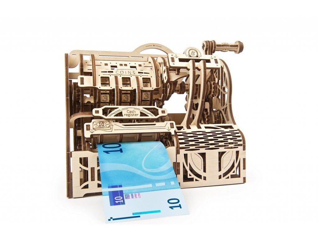 Art déco ihletésű pénztár, amely bankjegyeket és 10–35 mm átmérőjű érméket fogad és számol. Külön rekeszek a papírpénznek, aprónak, jegyzeteknek; a fiókok kóddal és kulccsal zárhatók, nyitáskor a számláló nulláz. A mechanika nyitott, így követhető a fogaskerekek játéka. Játékhoz, limonádéstandhoz vagy perselyként is kiváló. 405 precíz faelem, közepes szint; részletes leírás, ragasztó nélküli építés. Masszív, tartós kivitel, amely egyszerre dekoratív és hasznos – gyerekeknek pénzügyi alapismeretekhez is remek eszköz.