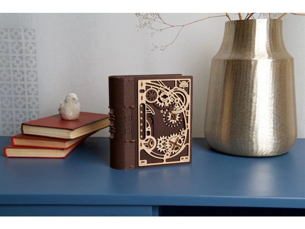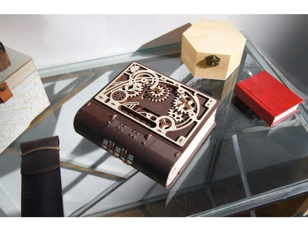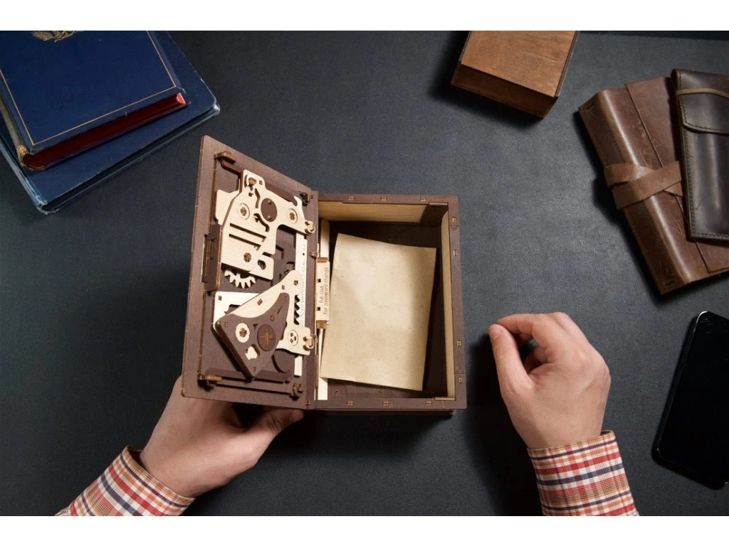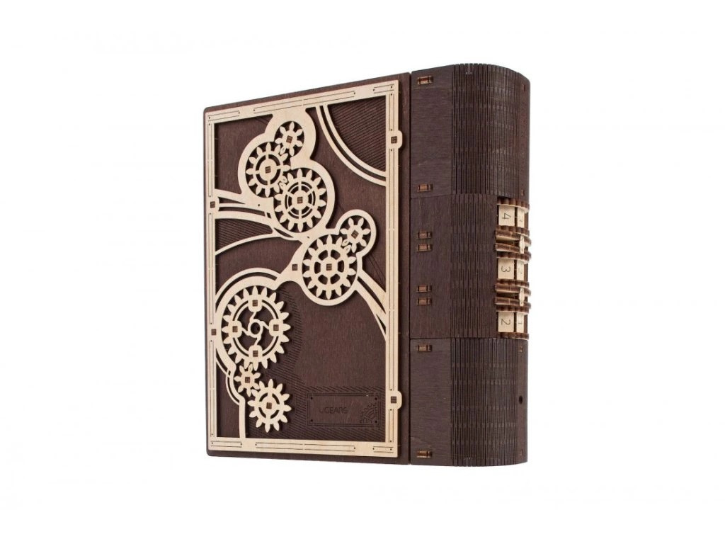 Könyvnek álcázott, kódzáras rejtekhely. A homlokzaton forgó fogaskerekek és a gerincen lévő számtárcsa adják a „varázslatot”: a háromjegyű kombináció és a kulcs elfordítása után feltárul a rejtett üreg – üzenetnek, ékszernek, ajándéknak tökéletes. 263 elemből, fenntartható forrású fából készül, ragasztó nélkül épül. A szerkezet építés közben problémamegoldásra és kreativitásra ösztönöz, elkészülve pedig stílusos polcdísz. Egyedi ajándék, amely egyszerre praktikus és játékos; természetes, sötét és világos faelemek elegáns kontrasztja teszi különlegessé.