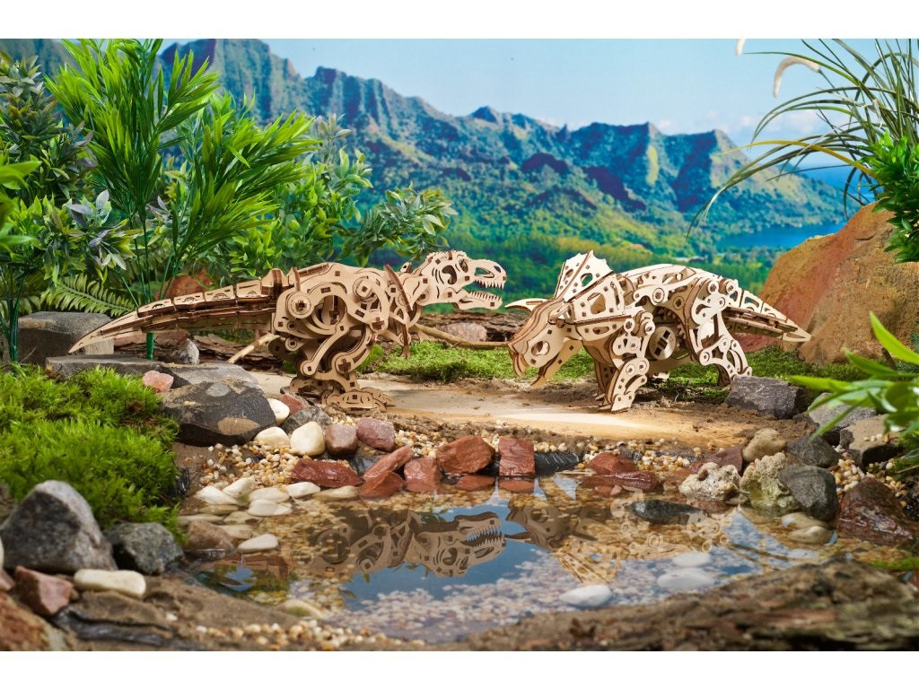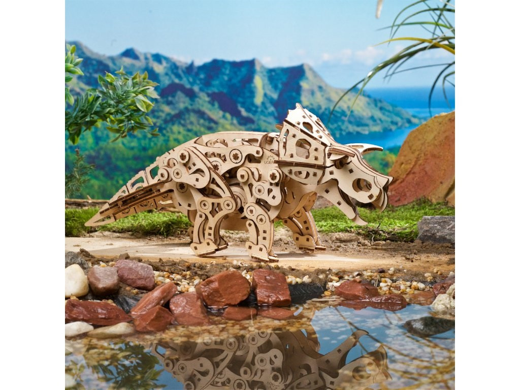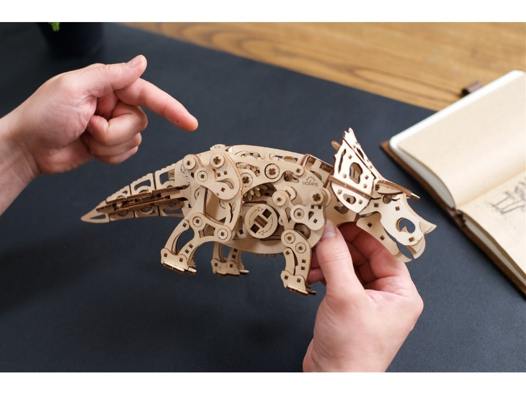 Ősállat, amely életre kel: a gumis lendítős mechanika néhány húzás után sétára indítja a „háromszarvút”, miközben bólogat és csóvál. 14+ korosztálytól ajánlott, kb. 8 óra építés; fejleszti a kézügyességet és a türelmet. A faelemek elővágottak, festhetők, így saját „őskori” színvilágot adhatsz neki. Tartós, mégis barátságos játék és különleges lakásdekor egyszerre – a dinoszauruszrajongók könyvespolcán vagy íróasztalán garantáltan főszereplő lesz.
