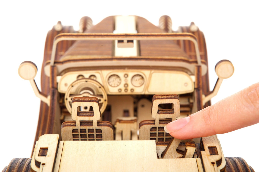 A klasszikus autózás esszenciája fa formában. Nyitható ajtók és motorházfedél, kormányozható első futómű, V-motor mozgó dugattyúkkal. A rugómotor egy felhúzással kb. 4 m-t teljesít, a váltó üresjáratot és hátramenetet kínál, így parkolni és manőverezni is élmény. A részletgazdag, gravírozott karosszéria vitrinben is remekül mutat, de versenyre kész a Ugears-garázs bármely tagjával. 437 alkatrész, magas nehézség; tiszta, ragasztómentes építés lépésről lépésre útmutatóval.