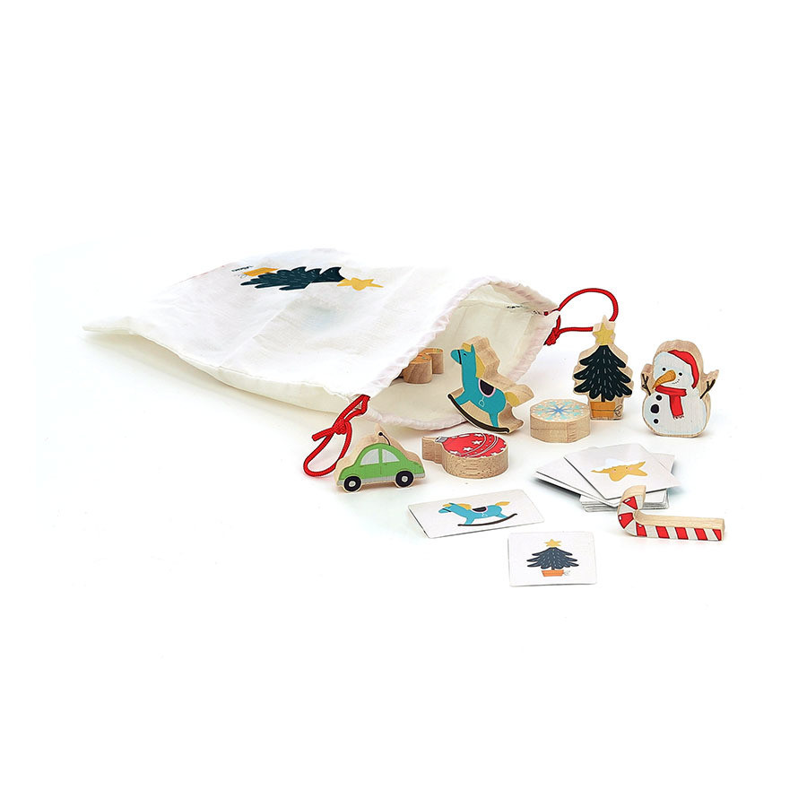Minden nap egy meglepi – és a végén egy teljes játék! A 24 ablak mögött fa figurák, képkártyák és egy textil zsák lapulnak; karácsonyra összeáll a „Tapints és találj” szenzoros játék. A kicsik csak a kezüket használva keresik ki a zsákból a kártyán látható tárgyat, nagyobbak lottó/bingó változatban is játszhatják. Fejleszti a tapintási észlelést, a koncentrációt és a szókincset, miközben közös családi élményt ad. 21 fa elem, 20 kártya, több játékmód – ünnepi kiadás, praktikus csomagolásban.