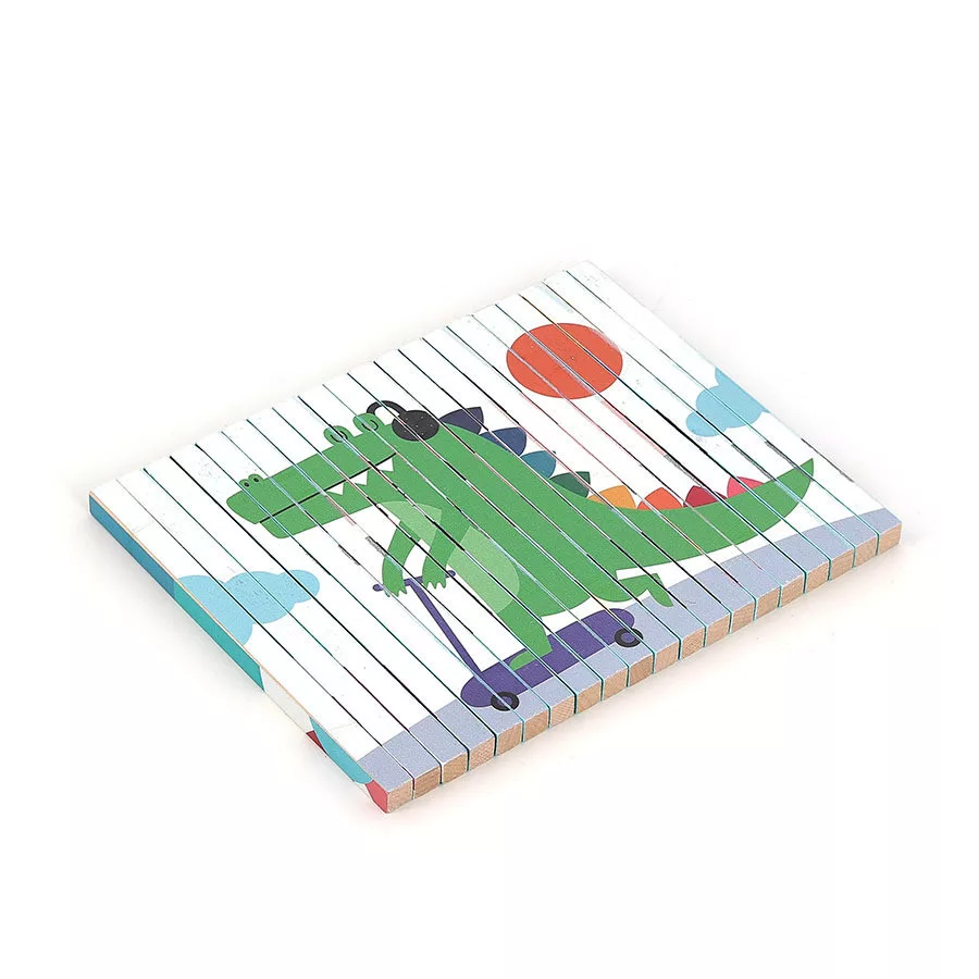Négy kép egyetlen különleges puzzle-ben: a 20, mind a négy oldalán nyomott fa pálcát állványba csúsztatva az állatok (vörös panda, jegesmedve, krokodil, panda) a nézőszögtől függően váltják egymást. A 4D kirakó fejleszti a logikus gondolkodást, a megfigyelőképességet és a kézfinomságot; a pálcikák pontos illesztése türelmet és fókuszt kér. Andy Westface élénk, mégis letisztult grafikái történetmesélésre hívnak. Látványos dísz és értékes fejlesztőjáték 5+ korosztálynak.