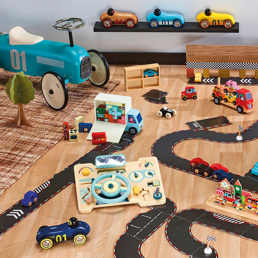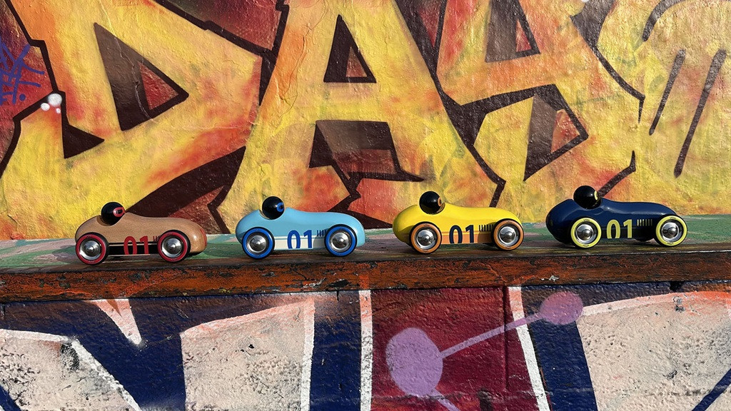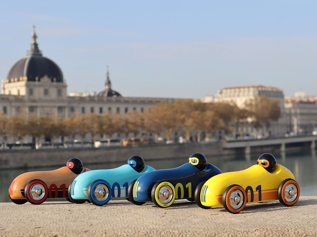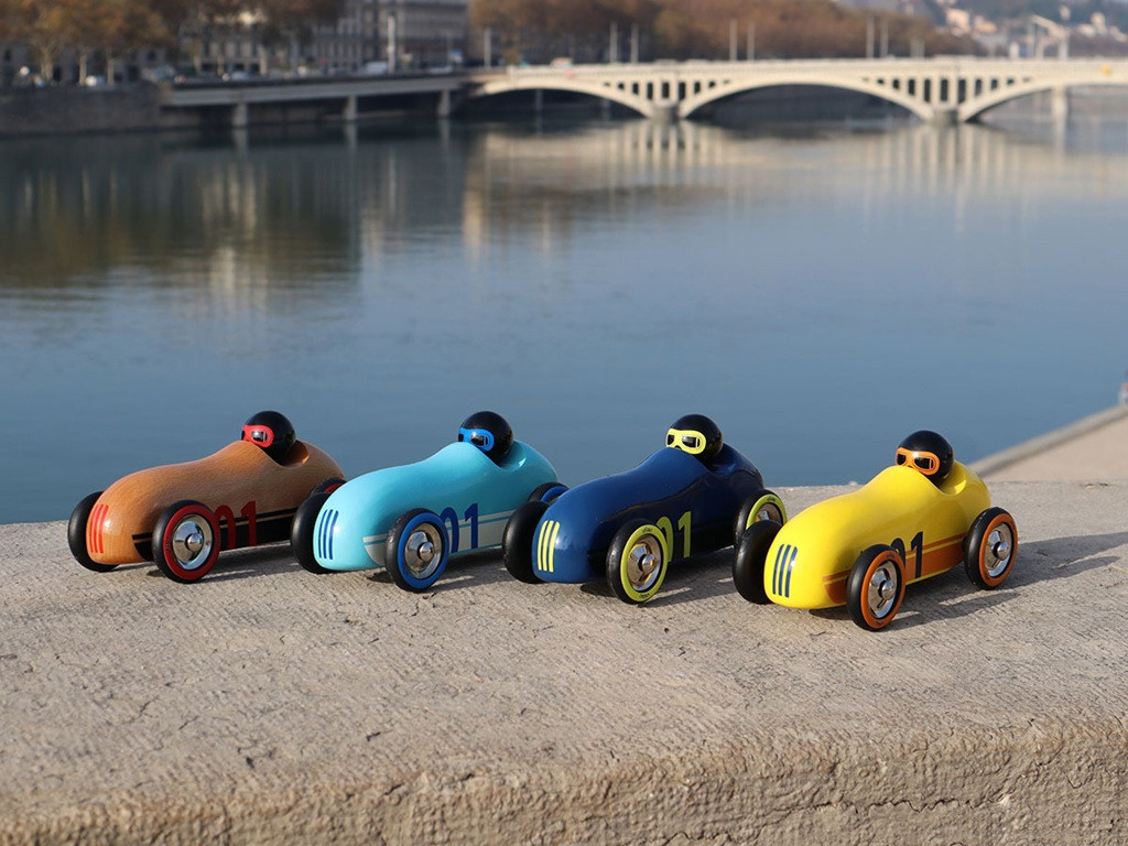 Áramvonalas, retró ihletésű fa autó friss türkiz színben. A masszív bükkfa testet kézzel, merítőlakk eljárással vonják be, így ellenálló és gyönyörűen fényes felületet kap. A kocsi tologatása közben fejlődik a finommotorika, az irányítás és a mozgástervezés; a játék szókincsbővítő hatású is (hangutánzás, közlekedési szabályok). Franciaországban készül, igényes díszdobozban – stílusos ajándék, amely a gyerekszobát és a nappalit is feldobja, sőt gyűjteménybe illő design-tárgy.