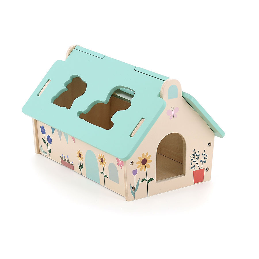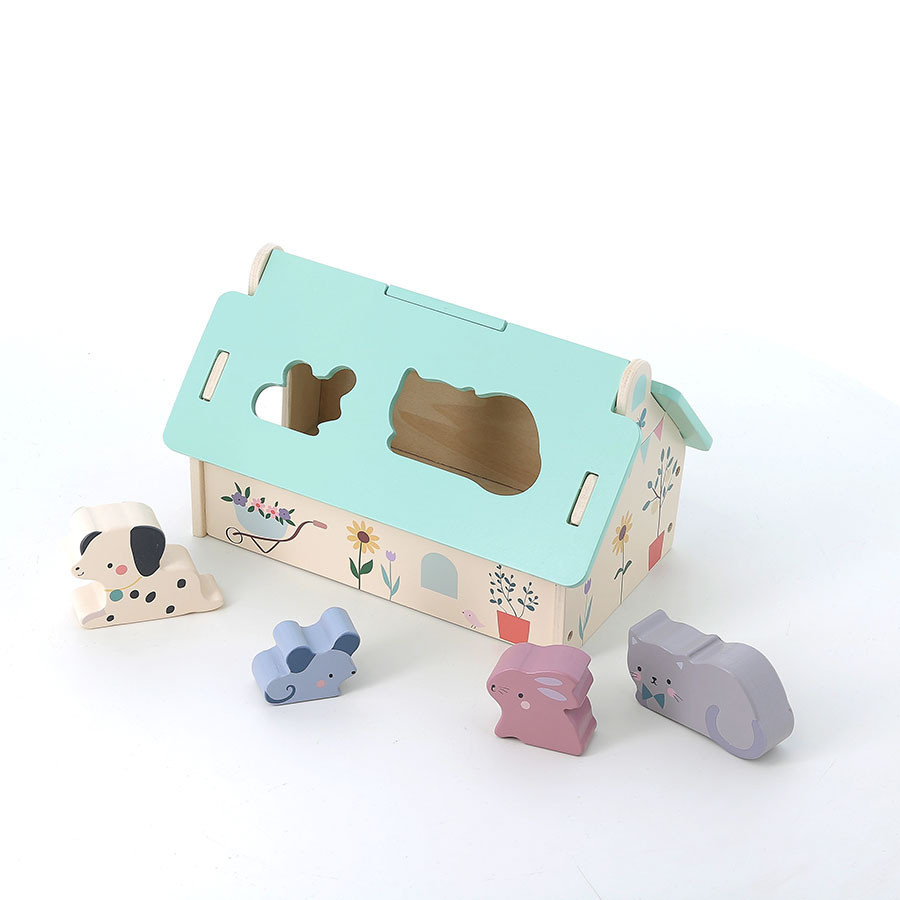 Mesés kis házikó levehető tetővel és négy állatfigurával (kutya, egér, macska, nyuszi). A gyerekek a megfelelő nyílásokba illeszthetik a figurákat, majd szabad játékra is használhatják a készletet. Fejleszti a finommotorikát, a problémamegoldást és a szókincset, Montessori-szellemiségben. Sarah Betz finom pasztelljei barátságossá teszik a dizájnt. Strapabíró fa kivitel, biztonságos élek, kiváló ajándék.