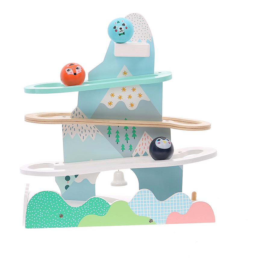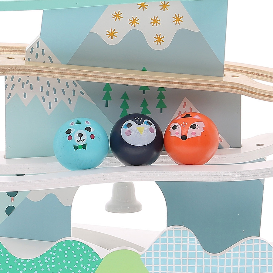 Michelle Carlslund északi világát idéző fa „hegyi” pálya, ahol a kis figurák versenyt futnak lefelé – ki csöngeti meg először a célban a csengőt: a pingvin, a medve vagy a róka? A ritmusos gurulás és a célba érés motiváló élmény, közben fejlődik a kéz–szem koordináció, a kitartás és a fókusz. Környezettudatos, minőségi kivitel, finom pasztellszínekkel. Látványos dísze a gyerekszobának és hosszan lekötő ügyességi játék egyben.