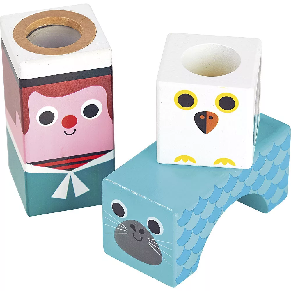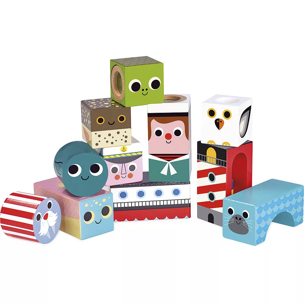 Tengerre fel! A 11 darab szenzoros fa kocka vidám, tengeri illusztrációkkal (Ingela P. Arrhenius) és változatos hanghatásokkal inspirálja a kicsiket. A rázás, gurítás, építés közben fejlődik a finommotorika, a kétkezes koordináció és a figyelem; a hangok utánzása a beszédindítást is támogatja. A sima, lakkozott felület és a lekerekített sarkok biztonságos használatot garantálnak. Esztétikus, retro hangulatú grafika, amely játék és dekoráció egyben – sokféle játékmódra, hosszú éveken át.