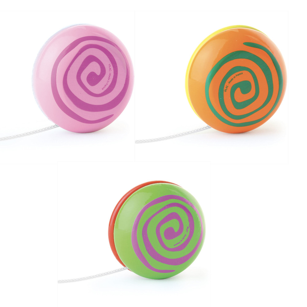 Színes, spirálmintás fa jojó több változatban. Nosztalgikus ügyességi játék, amely kiválóan edzi a finommotorikát és a koordinációt. Ajánlott: 5+.