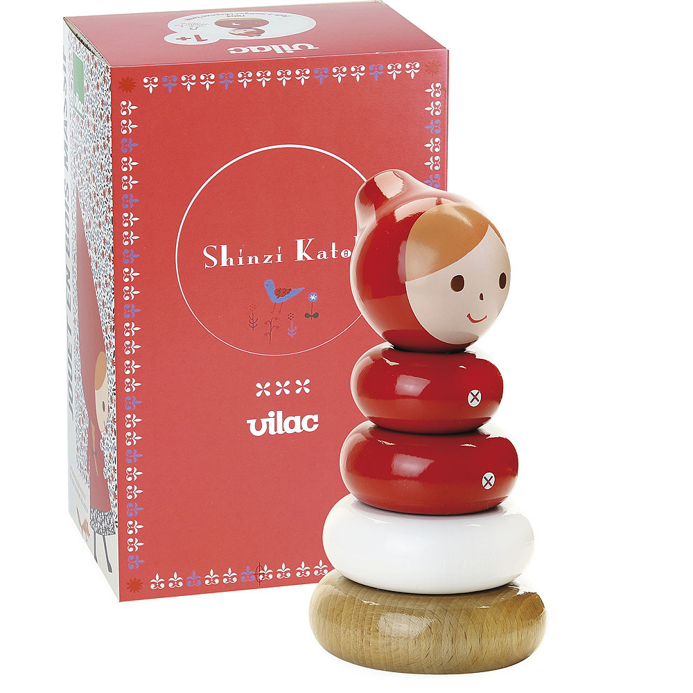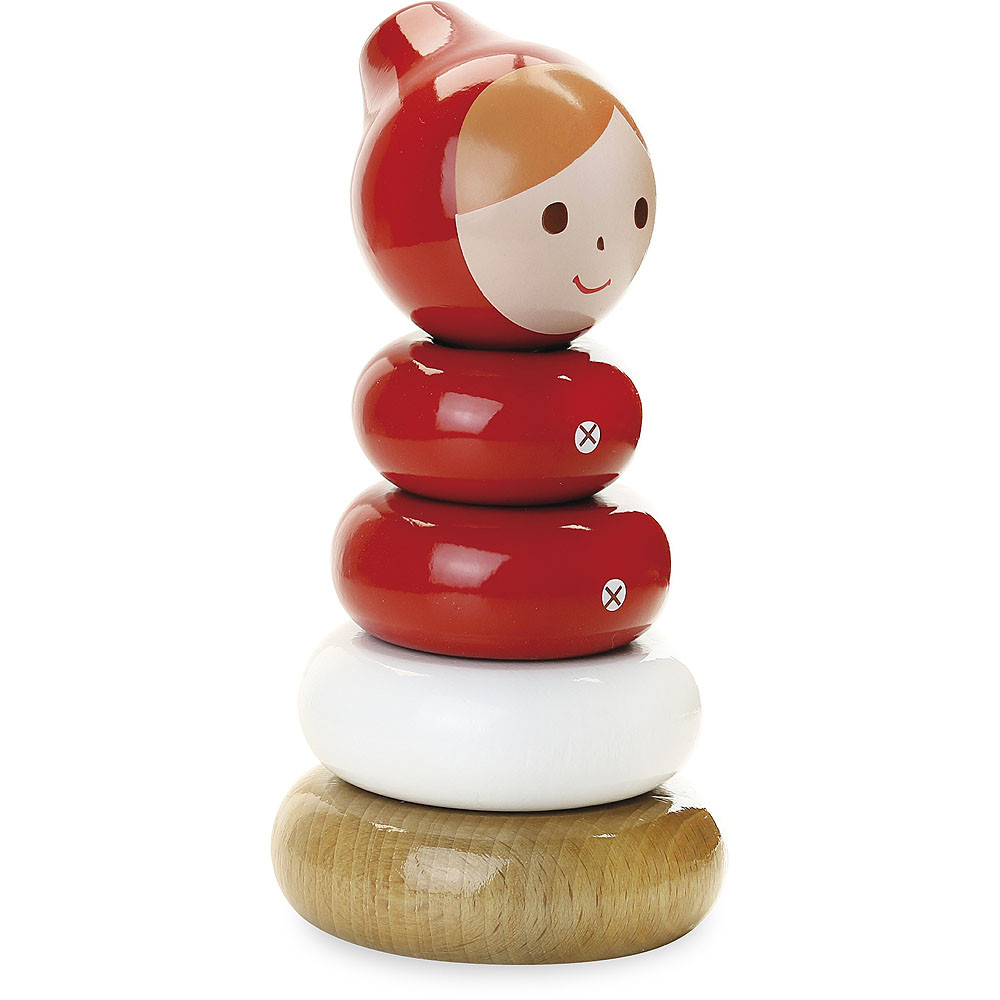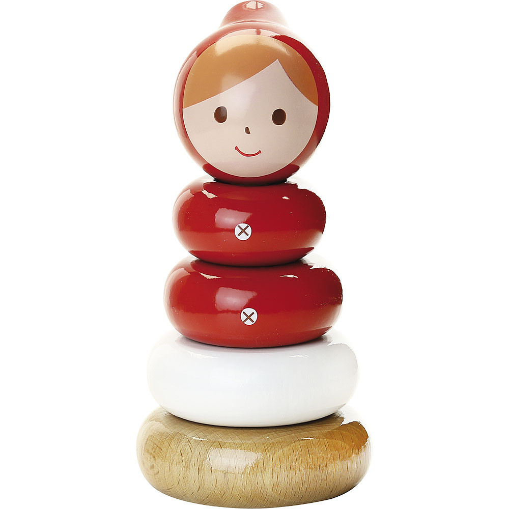 Klasszikus rakosgató Shinzí Katoh történetmesélő illusztrációival. A gyerekek a gyűrűket sorba rendezve „felöltöztetik” Piroskát, miközben fejlődik a finommotorika, az egyensúlyérzék és a sorrendiség. A lakkozott, tömör fa elemek kellemes tapintásúak és tartósak, a színek élénkek, mégis harmonikusak. Francia gyártású minőség, letörölhető felületekkel. Barátságos, mesés darab, ami játék közben beszélgetésre és történetalkotásra is ösztönöz.