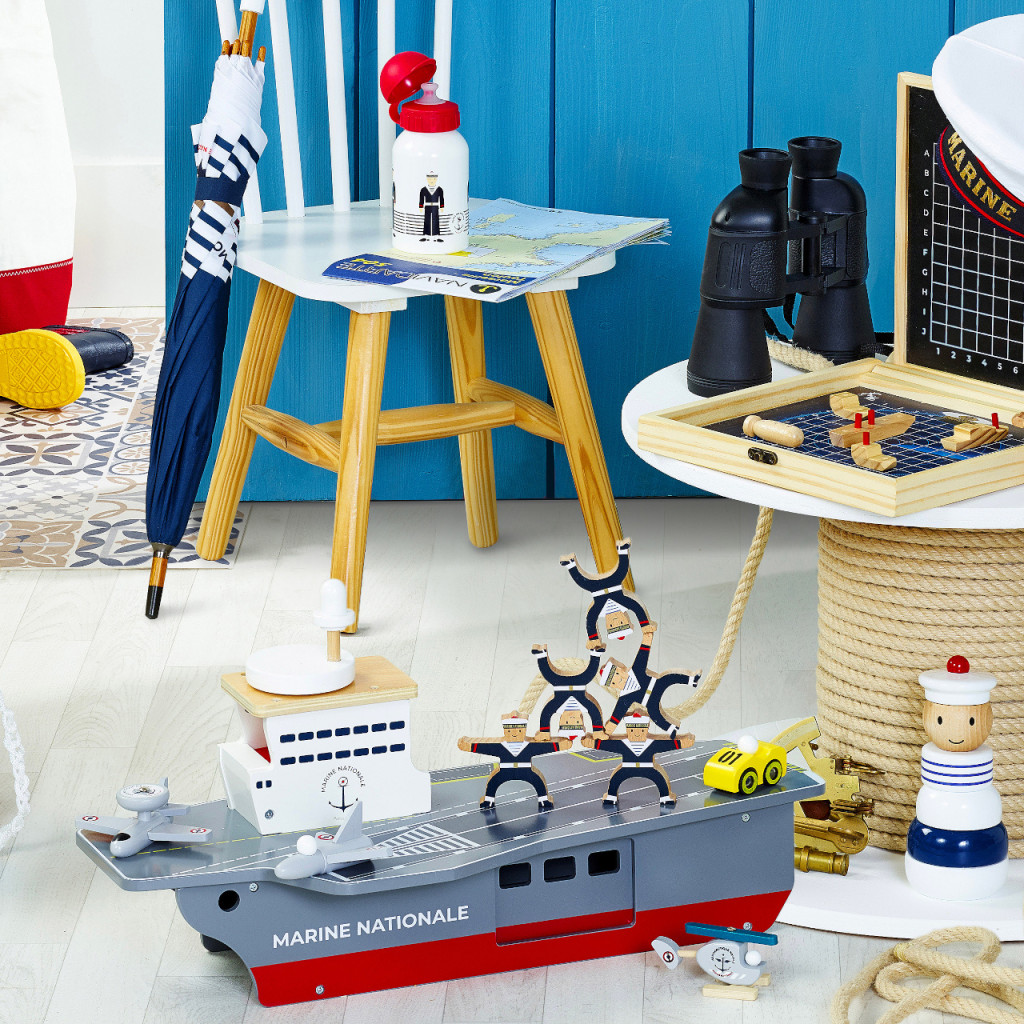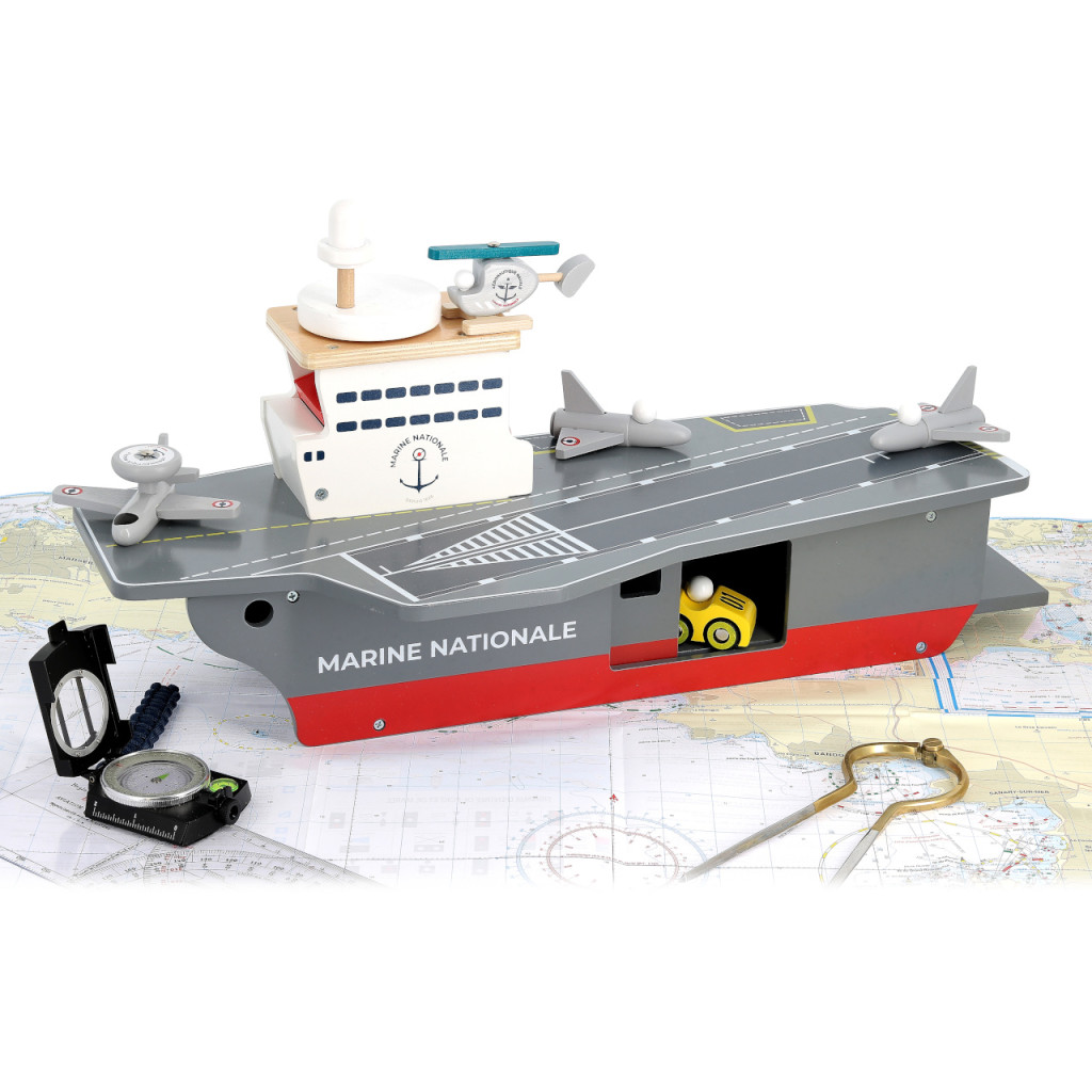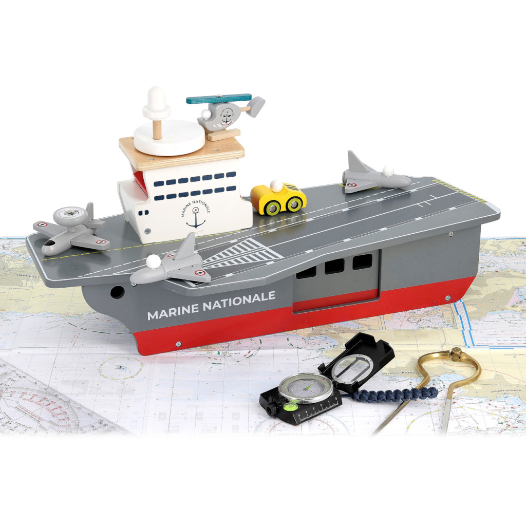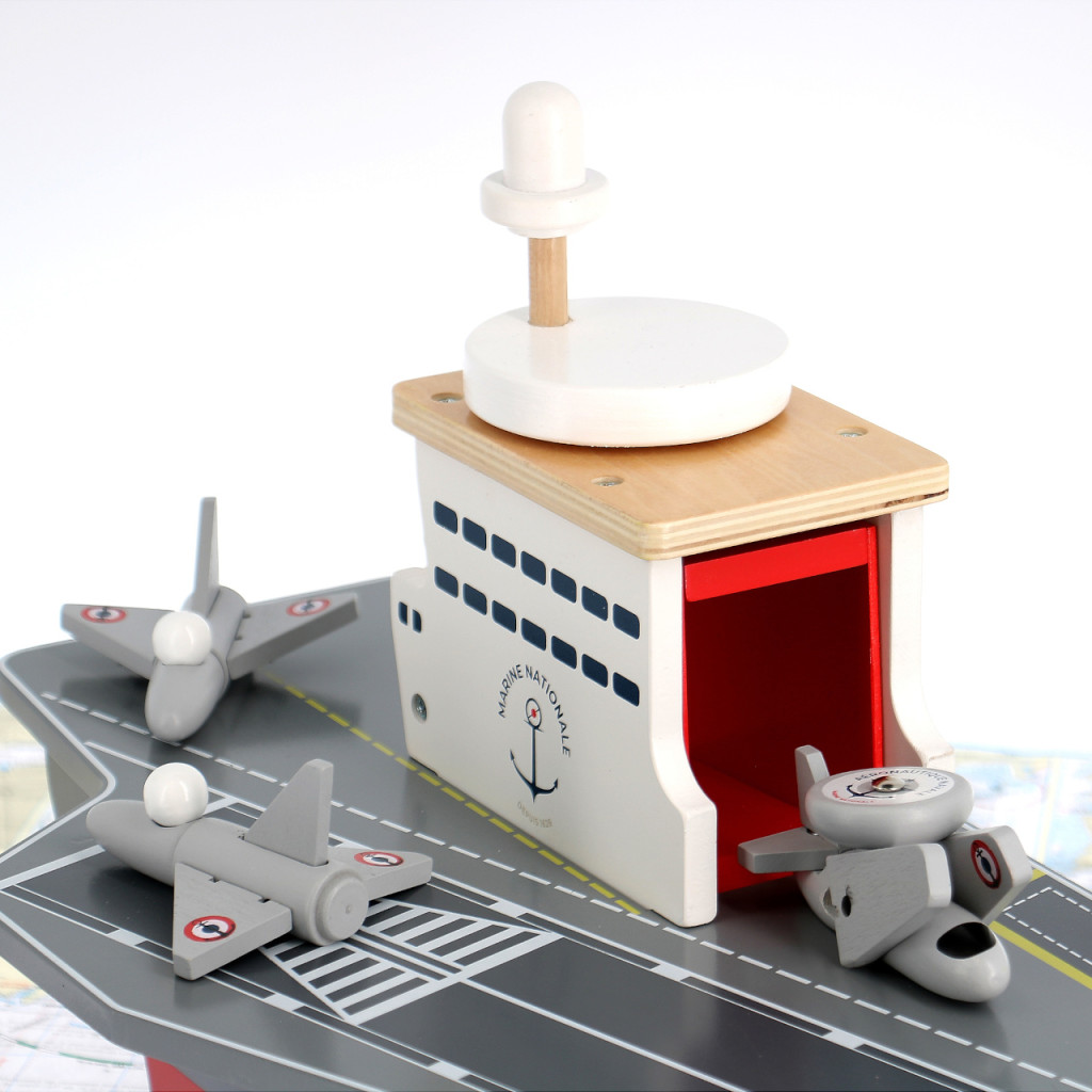 Monumentális játékhajó a nagy kalandokhoz: a fa repülőgép-hordozóhoz vadászgépek, felderítőgép, helikopter és szervizjármű is tartozik. A tágas, ajtókkal zárható raktér praktikusan elnyeli a kiegészítőket, a fedélzetet pedig a toronyban lévő „radarkerékkel” működtetett lift köti össze – ötletes, mégis gyerekbarát megoldás. A részletgazdag festés a Francia Haditengerészet jelzéseit idézi. Erős rétegelt lemez konstrukció, amely sokáig bírja a mindennapi bevetéseket.