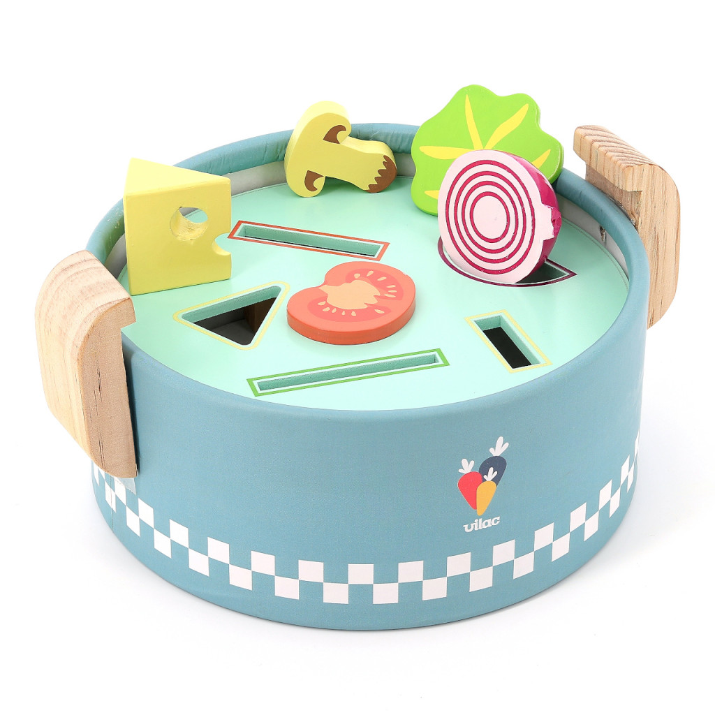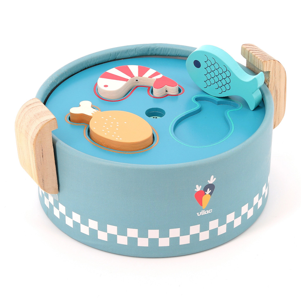 Okos „minilábas” három cserélhető, lyukasztott fedőlappal és 13 betéttel. A gyerekek „főzés” közben válogatnak, dobnak, illesztenek – fejlődik a forma- és színfelismerés, a motorika és a koncentráció. Praktikus tárolás: minden elem elfér az edényben. Kombinált karton- és faelemek, ötletes dizájn, amely hosszú ideig leköti a kicsiket. Ideális ajándék kreatív, szerepjátékos gyerekeknek.