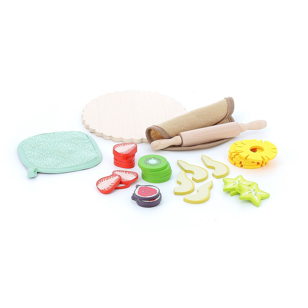 Készüljön mesteri pite! A sütős szettben tésztalap, sodrófa, forma és sok szeletelhető gyümölcs (eper, kivi, körte, ananász stb.) várja a kis cukrászokat. A díszítés és „tálalás” fejleszti a finommotorikát, a kreativitást és a színek-formák felismerését. Ideális kiegészítő gyerekkonyhához, teapartihoz, bolt-játékhoz. A strapabíró fa elemek és a puha filc toppingok együtt varázsolnak látványos desszerteket, amelyekkel a bábuk és plüssök is jól laknak.