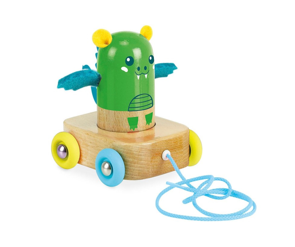 A barátságos sárkány levehető a futóműről, így külön csörgőként is használható; belsejében gyöngyök lágy, nem tolakodó hangot adnak. Húzás közben a kerekek stabilan követik a kicsit, támogatva a járást és az egyensúlyérzéket. A lakkozott fa felület sima és tartós, a színek meseszerűek. Francia gyártású minőség, amely játékosan kapcsolja össze a mozgást a hangélménnyel. Ideális választás, ha sokoldalú, értékálló első játékot keres.