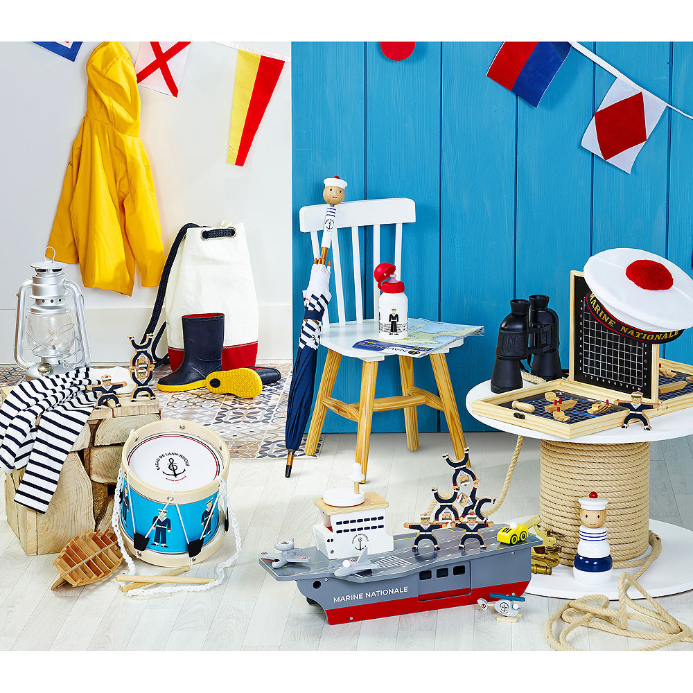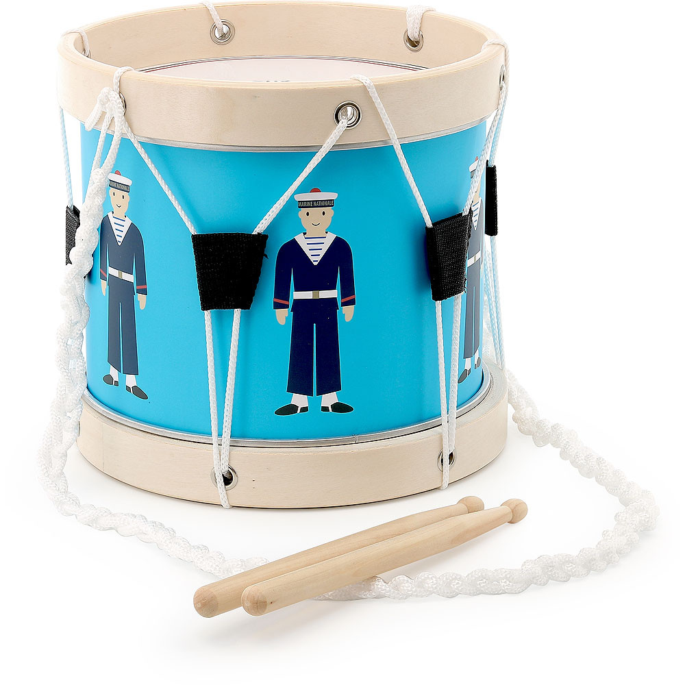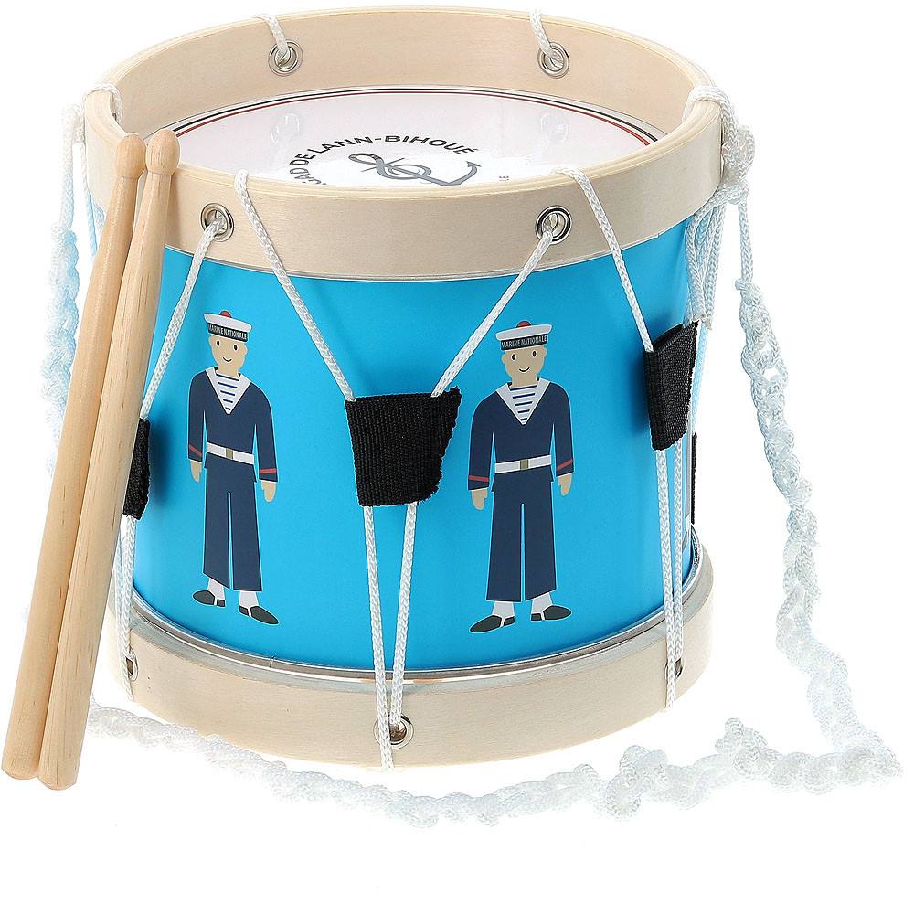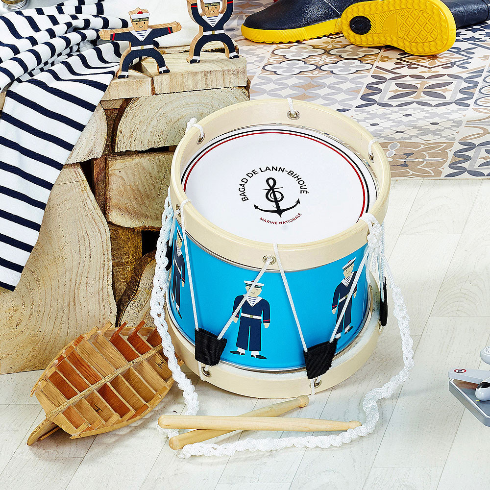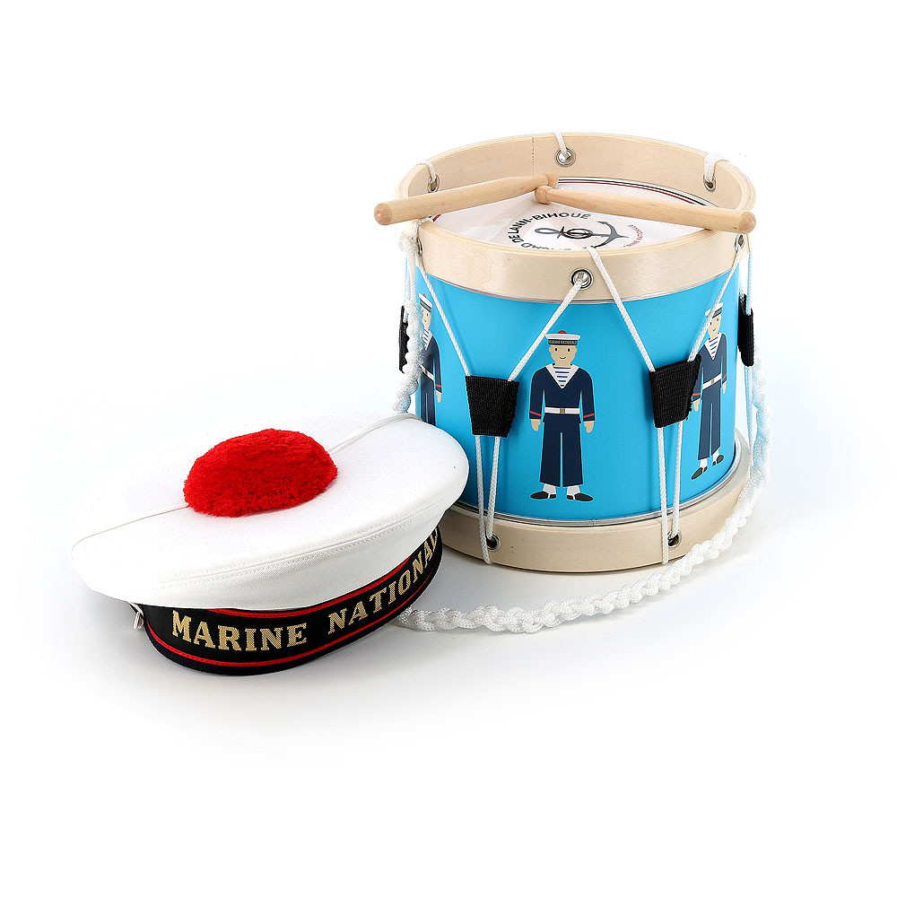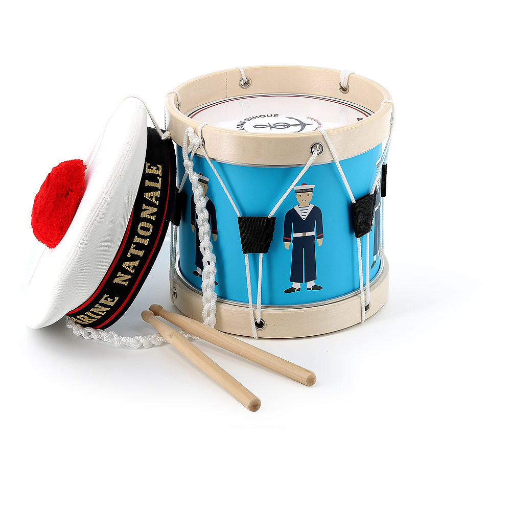Tengerész motívumos kis dob, amelyet a francia haditengerészettel együttműködésben terveztek – igazi karakterdarab. A vállpánt és a könnyű test kényelmes menetelést enged, a dobverők pedig azonnali sikerélményt adnak. A ritmusozás közben fejlődik a koordináció, a figyelem és az önkifejezés; közben a gyerekek játékosan ismerkednek a zenével. Tartós, igényes kivitel, kedves ajándék minden kis „kadétnak”. Megjegyzés: játékszer, nem professzionális hangszer.