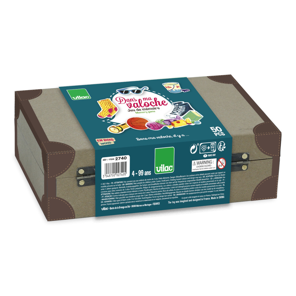 „A bőröndömben van…” – a klasszikus memória- és kommunikációs játék Vilac-féle, utazós kiadásban. A készlet 1 karton bőröndöt, textil zsákot és 50 darab, szépen illusztrált fa korongot tartalmaz. A játékosok sorban raknak a bőröndbe, majd pontosan felsorolják az eddig elhangzott tárgyakat – aki hibázik, kiesik. Fejleszti a rövid távú memóriát, a sorrendiség érzékét, a figyelmet és a beszédkészséget. Családi és csoportos foglalkozásokhoz is ideális, útra is könnyen vihető.