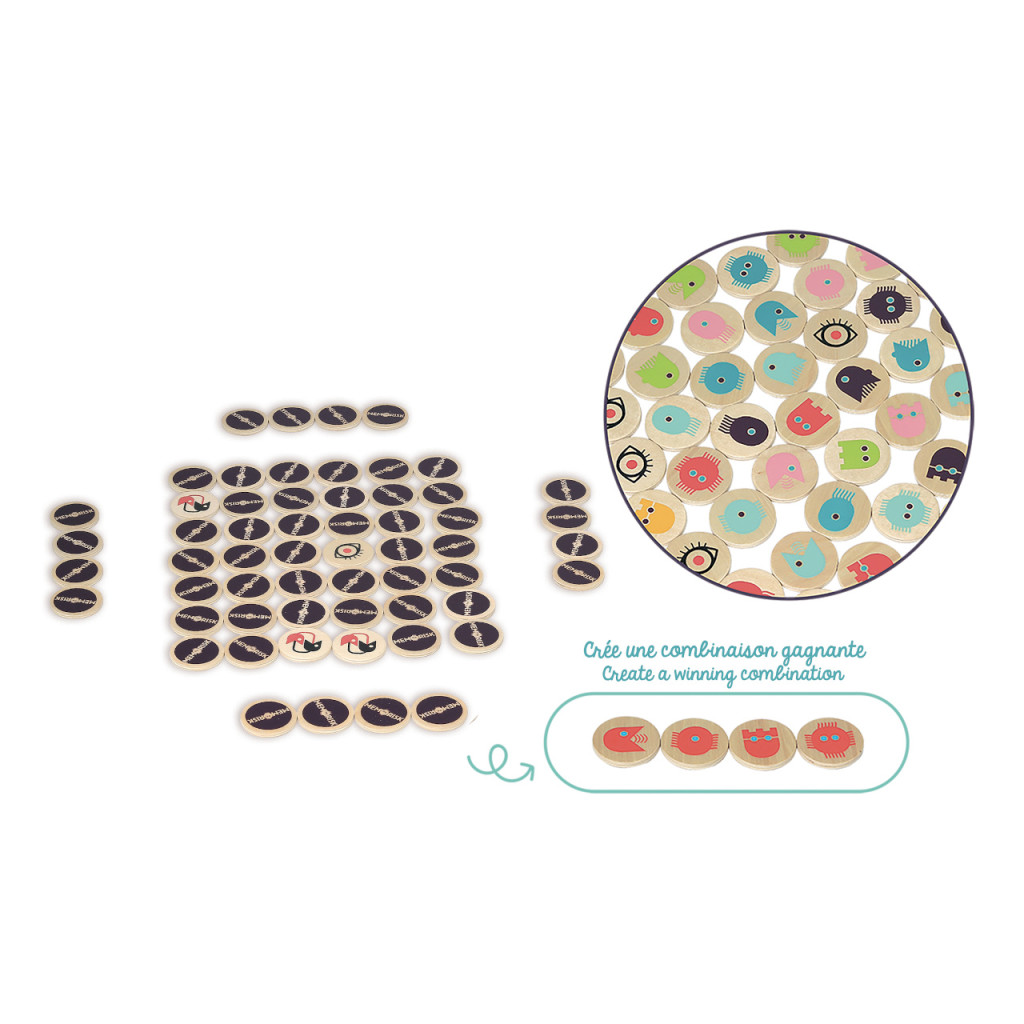 Feszült hangulatú, modern memória: 58 jellegzetes ikon, 2–6 játékos, számtalan fordulat. A körök elején mindenki titokban megnézi a saját szélső lapjait, majd egy közösből húzott elemmel igyekszik összeállítani a győztes kombinációt – miközben a többiek is ugyanarra törekednek. A rövid szabály megtanít taktikázni, figyelni és emlékezni; a fa és vastag karton elemek hosszú távon is bírják a gyűrődést. A vászonzsákos tárolásnak köszönhetően utazáshoz is ideális.