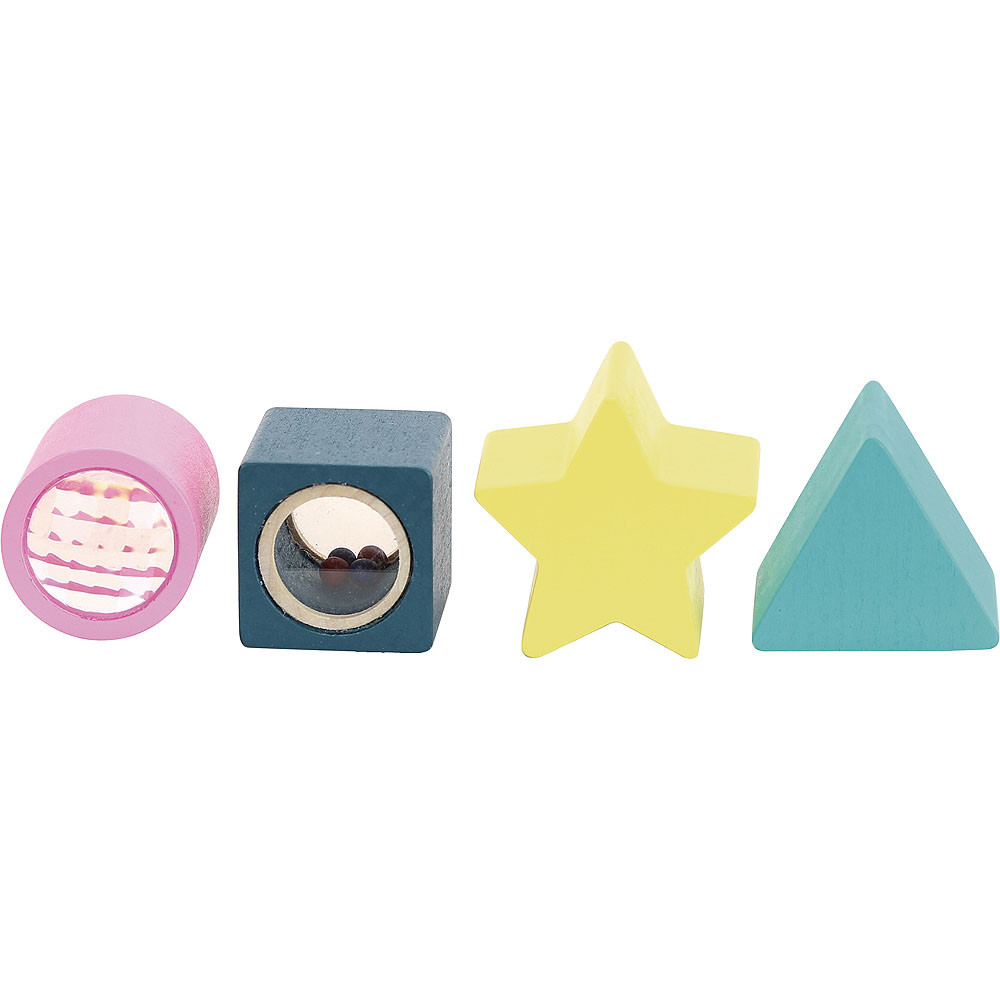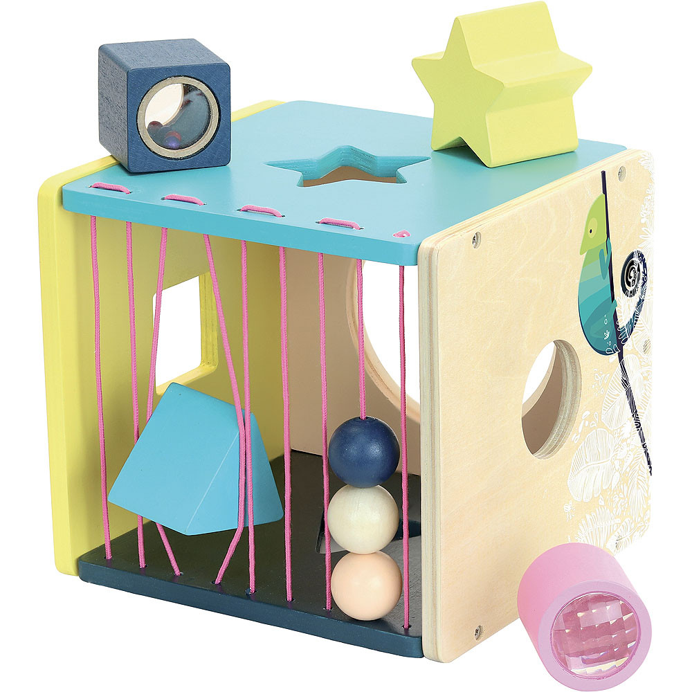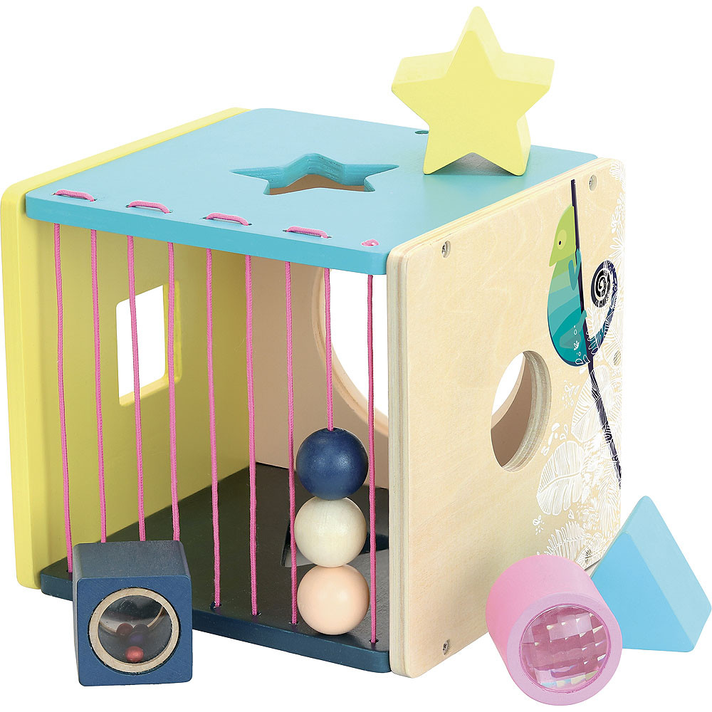 Kompakt motorikus kocka négy különleges betéttel: kaleidoszkóp-henger, csörgő kocka, csillag és háromszög, valamint rugalmas zsinóros oldal gyöngyökkel. A formabeillesztés és a szenzoros élmények együtt fejlesztik a finommotorikát, a tapintást és a színfelismerést. Modern, természetközeli dizájn, lekerekített élek, masszív fa kivitel. Ideális első készségfejlesztő 12–24 hónaposoknak.