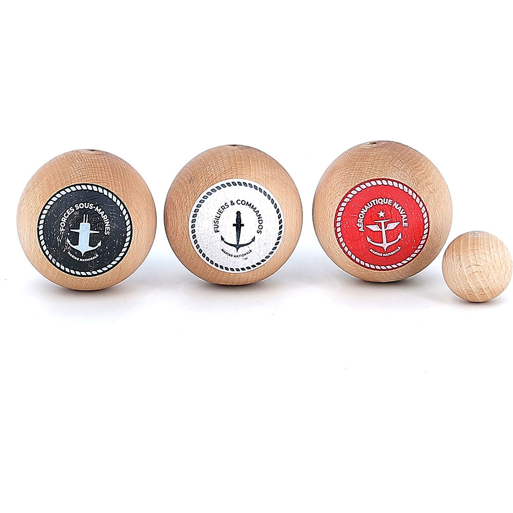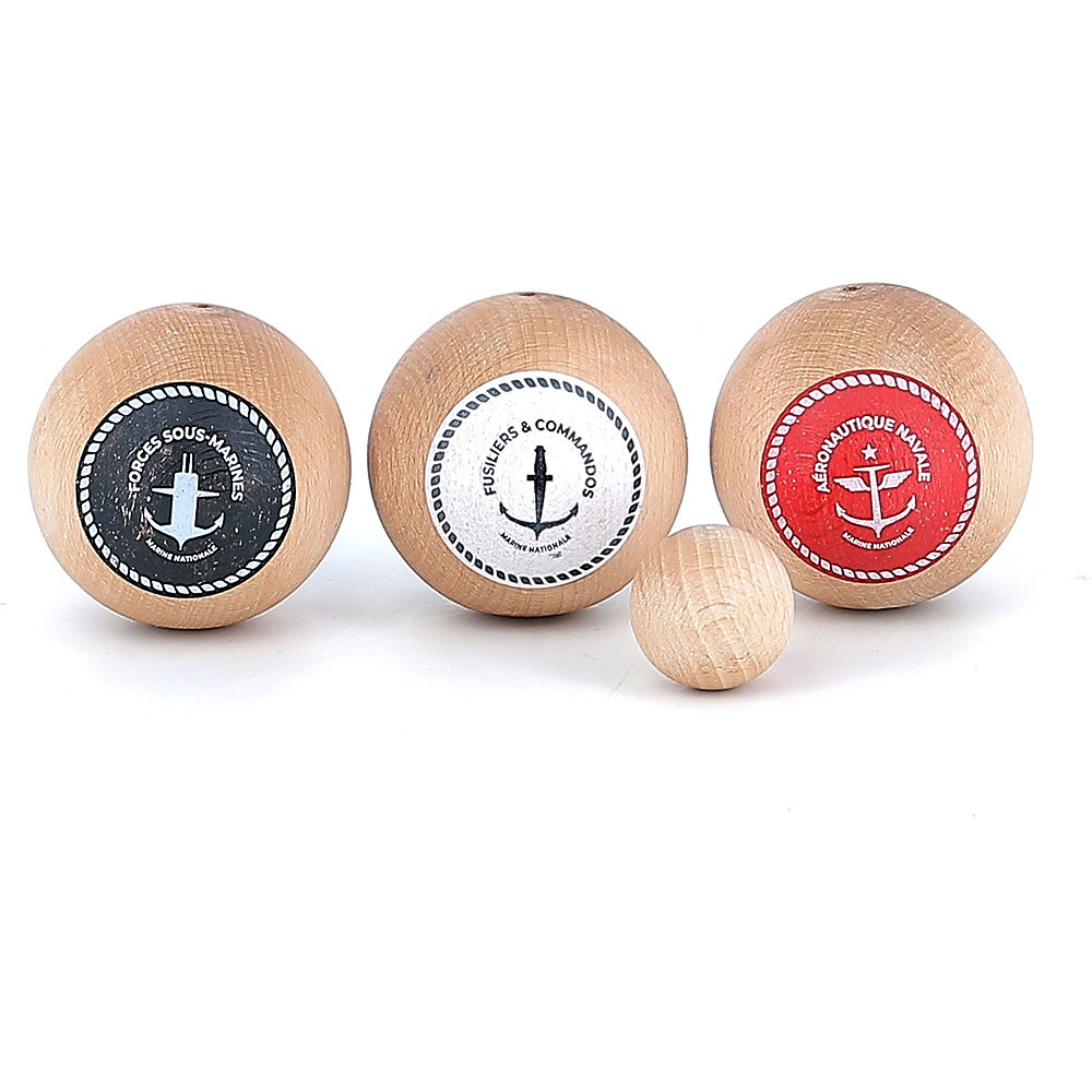 Klasszikus pétanque a francia haditengerészet ihlette dizájnnal, masszív lakkozott fából, vászonzsákban. Főbb tudnivalók: 2–6 játékos; 6 golyó + célgolyó; Franciaországban készült; a haditengerészettel közös kollekció; környezetkímélő gyártás.