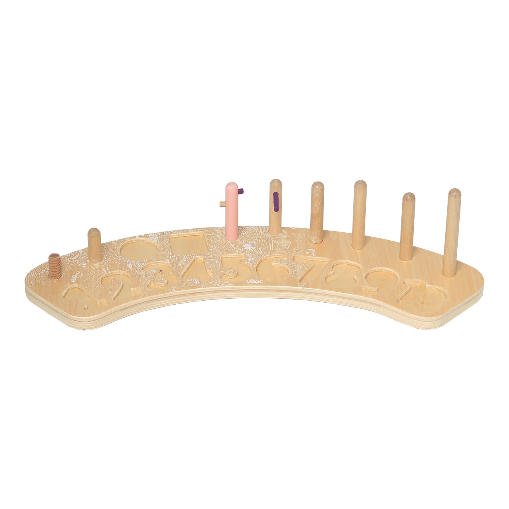 Okos, Montessori-szellemű készlet, amelyben a gyerekek a formák, színek és mennyiségek párosításán keresztül fedezik fel a számfogalmat. A masszív fa alaplaphoz 65 darab beilleszthető és felrakható elem tartozik; a különböző minták és kiosztások önálló próbálkozásra ösztönöznek. A gondosan megmunkált darabok kellemes tapintása támogatja a szenzoros tanulást, miközben fejlődik a türelem és a rendszerezés. Esztétikus, időtálló eszköz otthonra és fejlesztéshez.
